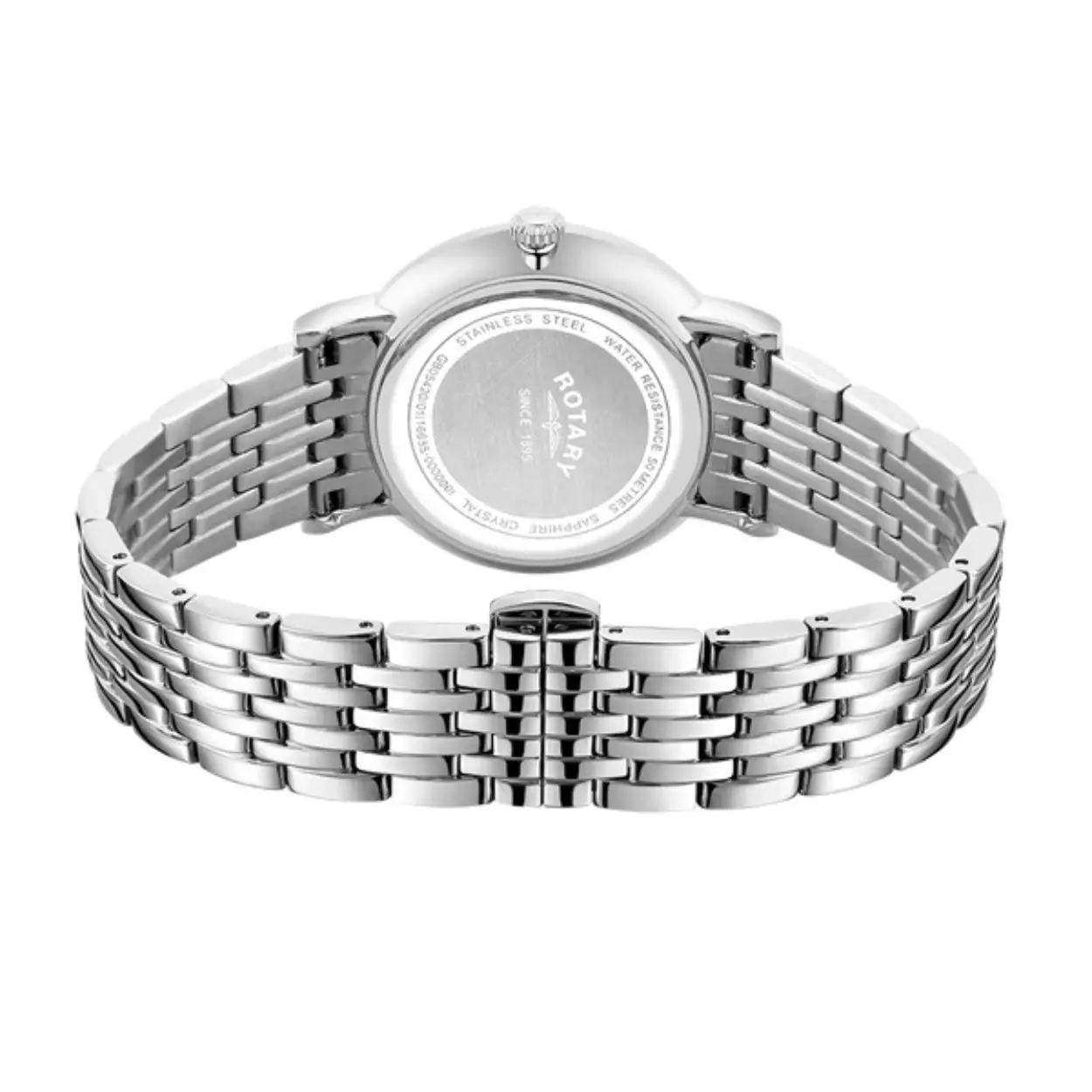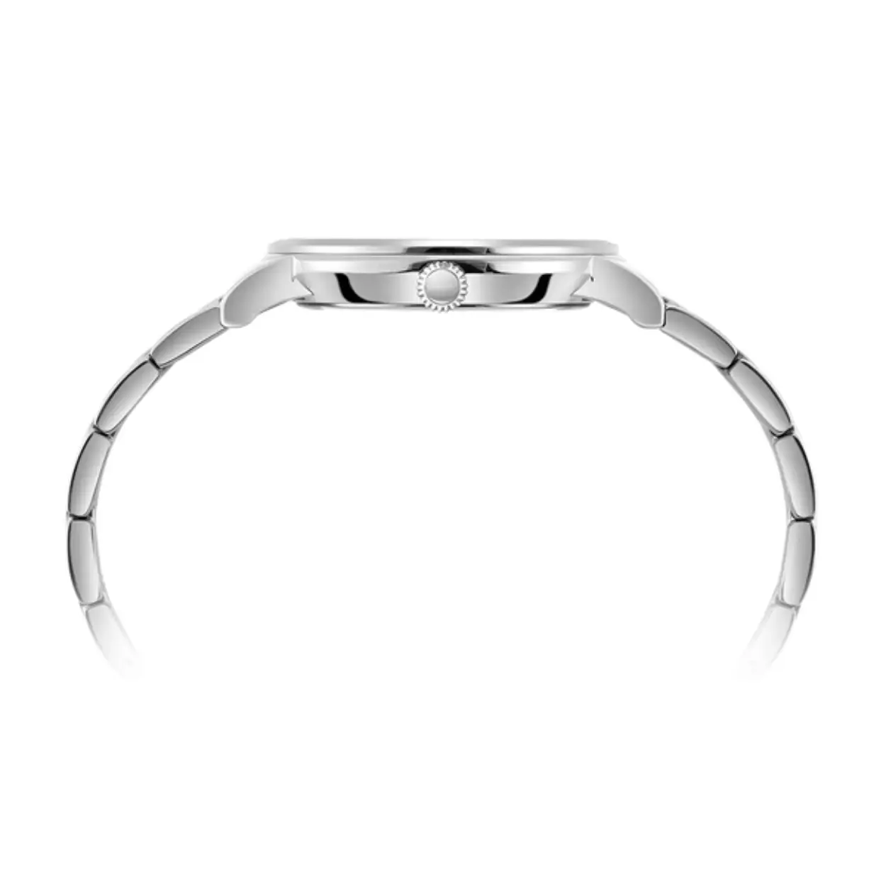 Made with strong stainless steel and sapphire glass, this classic timepiece features applied Roman numeral markers over a white guilloche dial along with radial and outer dial stitching. Water resistant to 50m, this Dress watch is powered by high-quality quartz and displays a time/date window for added practicality. The watch fits on the wrist with a 7-link tapered stainless steel bracelet and deployment clasp. A traditional, elegant and discreet accessory, the watch's case is 37mm in diameter, giving it an unimposing silhouette that quietly enhances any look.
