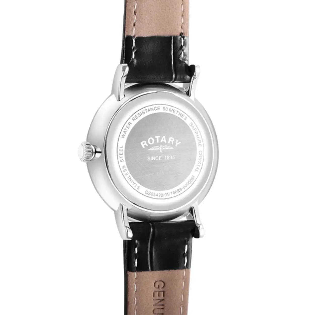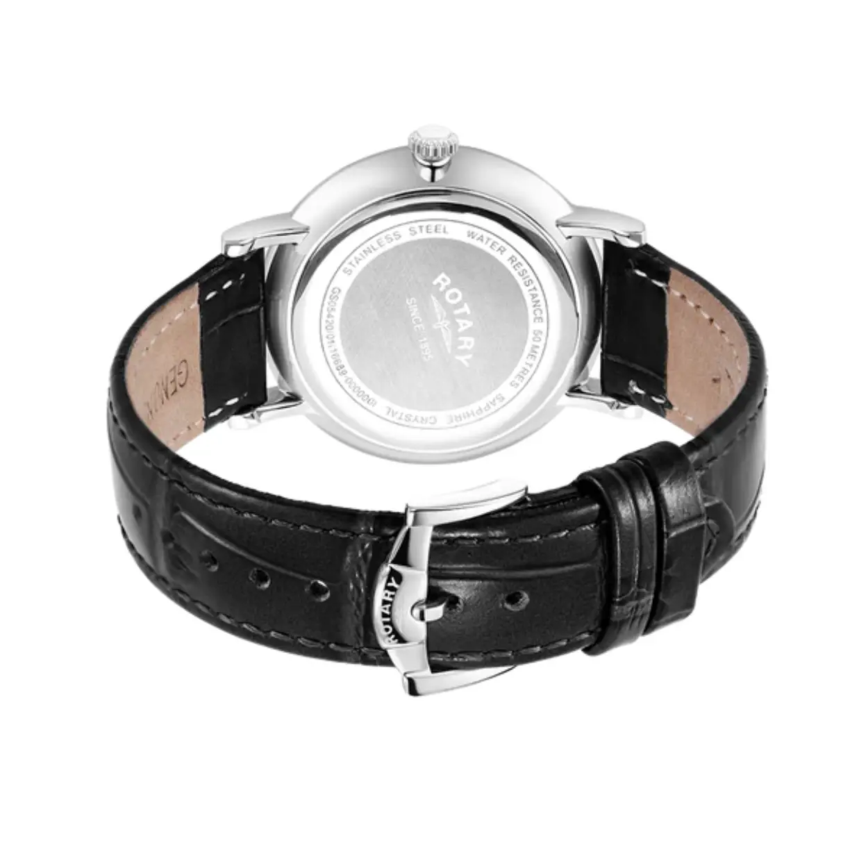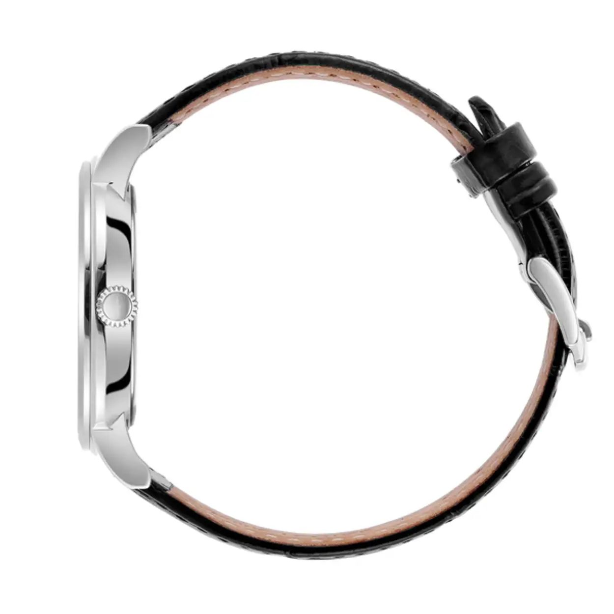 Expertly crafted with stainless steel and sapphire glass, this Dress timepiece features applied Roman numeral markers over a white guilloche dial along with radial and outer dial stitching. A genuine black leather strap ensures supple comfort when worn throughout the day, offering an elegant twist to the timepiece. Water resistant to 50m, this classic watch is powered by high-quality quartz and displays a day/date window for added practicality. A traditional, elegant and discreet accessory, the watch's case is 37mm in diameter, giving it an unimposing silhouette that quietly complements any look.