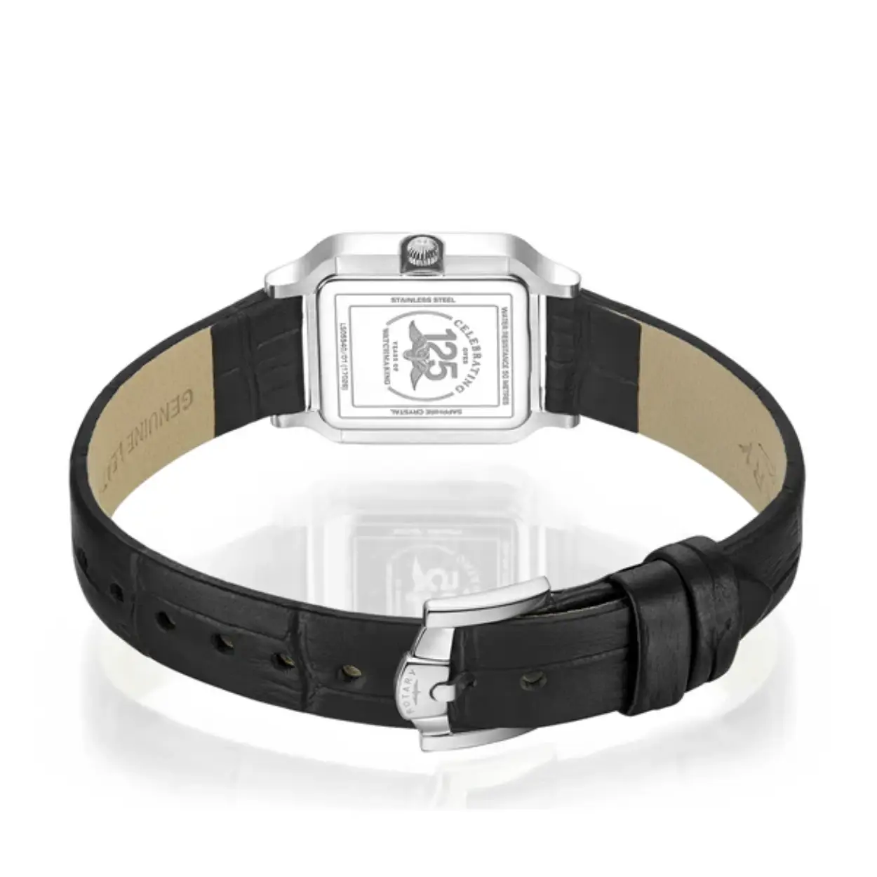 Een klassiek horloge van het merk Rotary, het vierkante model heeft een stalen kast en een zwarte leren band met croco bewerking. DE=e witte guilloché wijzerplaat heeft zilverkleurige indexen en wijzers. Het horloge is voorzien van saffier glas en is 5atm waterdicht.