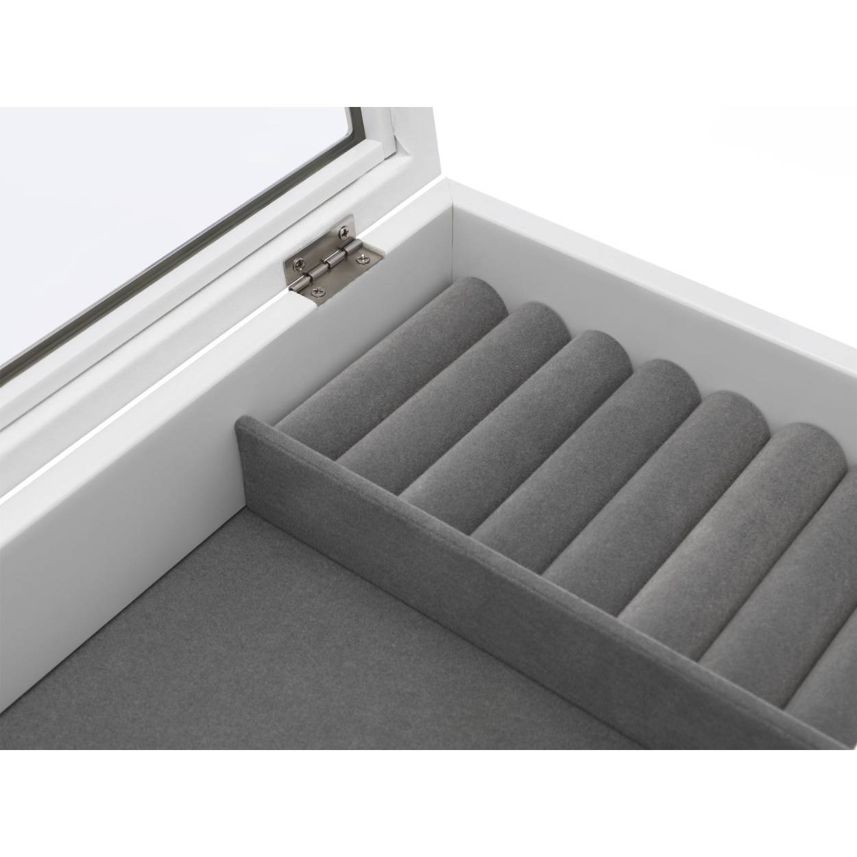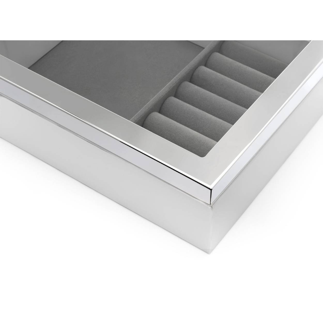 Je mooiste sieraden berg je op met deze sieradendoos van Zilverstad. Door de glazen deksel met zilveren rand, kun je precies zien wat erin zit. De binnenkant is bedekt met zacht velours, zodat je sieraden niet beschadigd worden. Aan de rechterkant is er ruimte voor ringen en oorbellen. In het vak aan de linkerkant kun je verschillende sieraden kwijt.