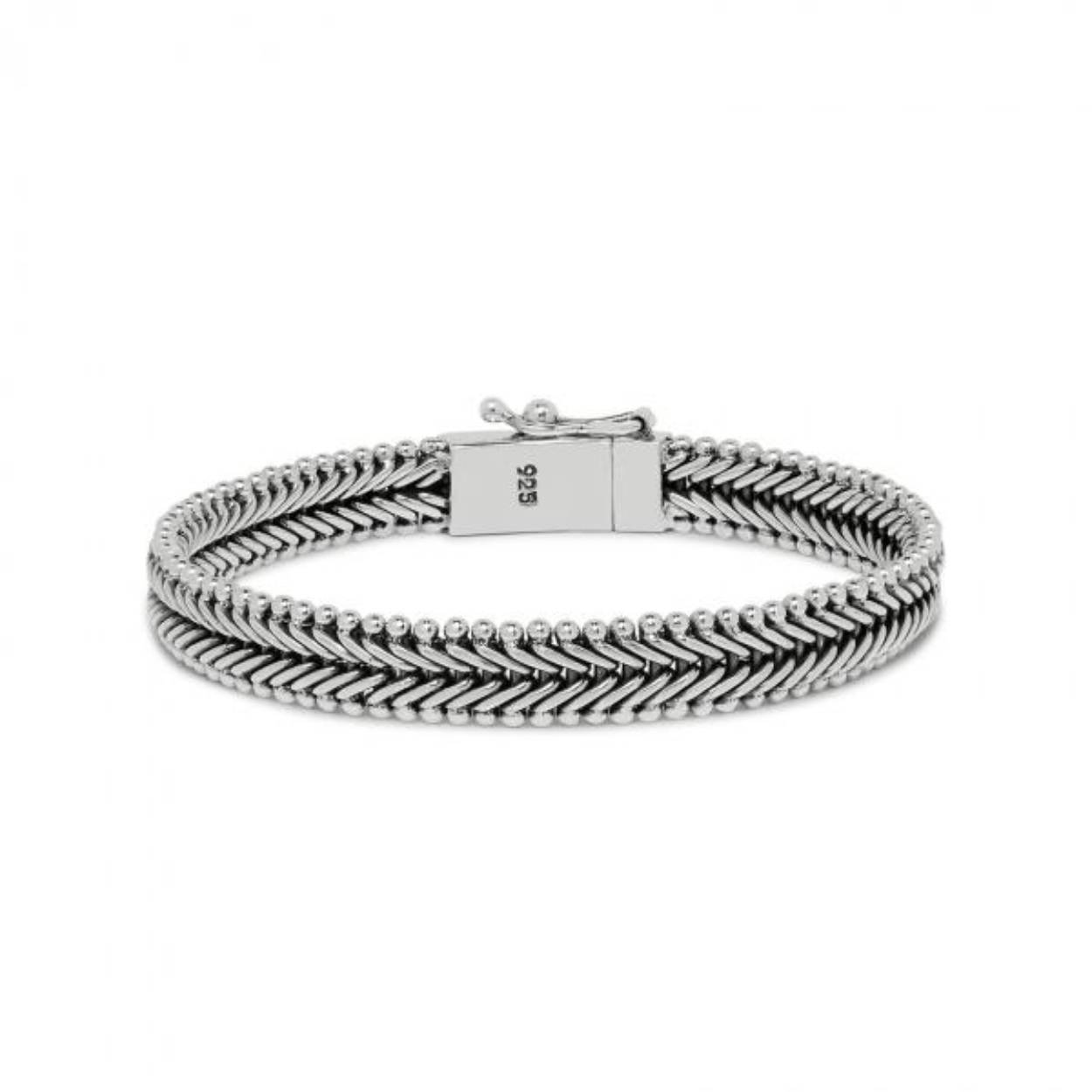 Deze fijn gevlochten Balinese Classic chevron armband van SILK Jewellery heeft een smalle vissengraat structuur waardoor hij erg subtiel en verfijnd oogt. Deze smalle zilveren armband sluit met een stevig bakslotje.