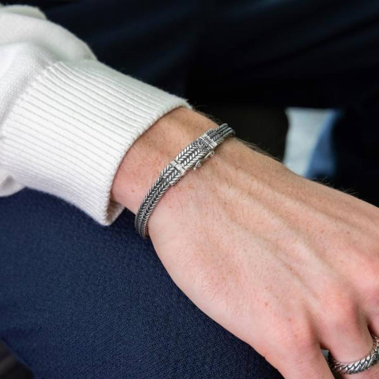 De gevlochten sterling zilveren strengen vormen een krachtig en tijdloos patroon dat zich herhaalt over de lengte van het sieraad, wat bijdraagt aan de tijdloze uitstraling van de armband.