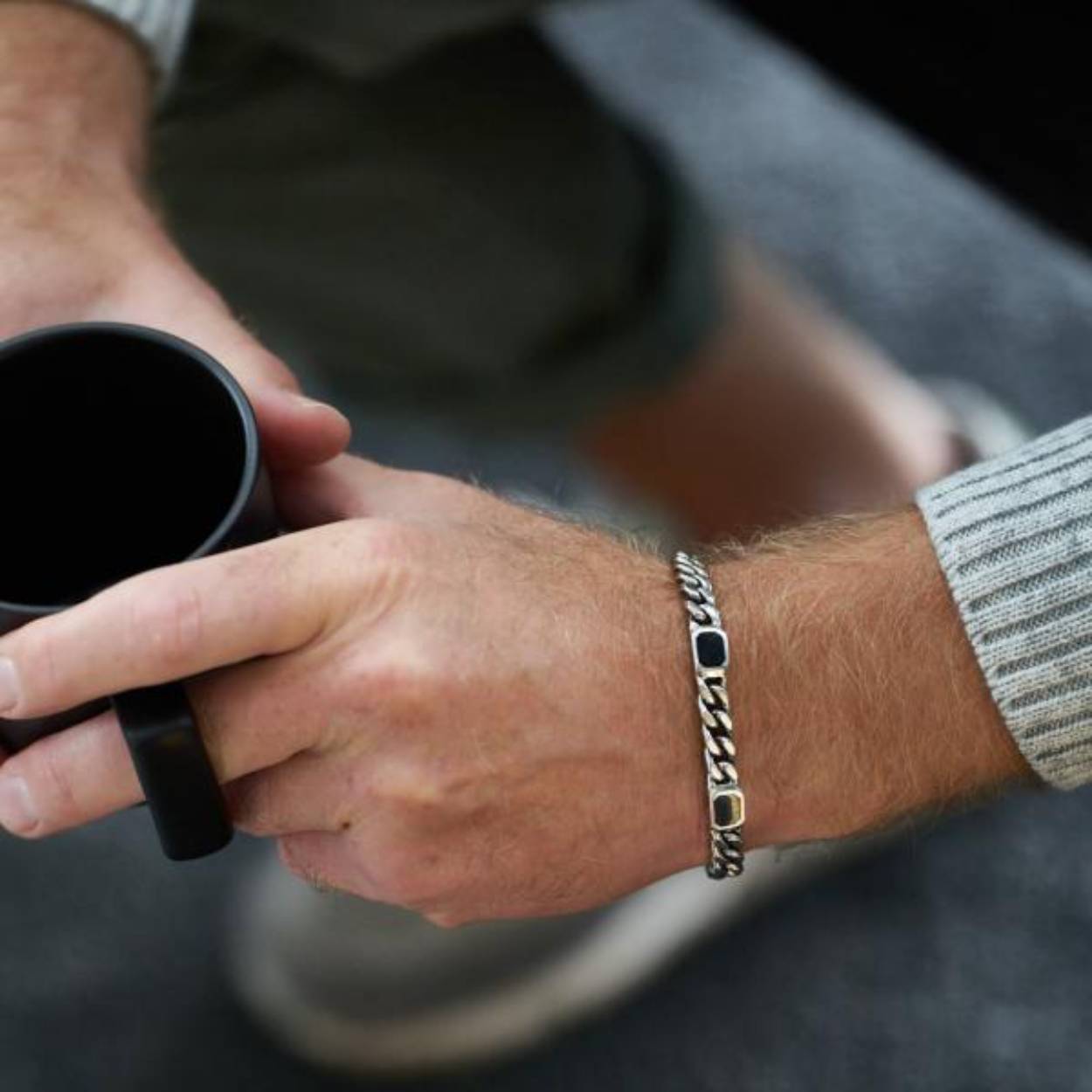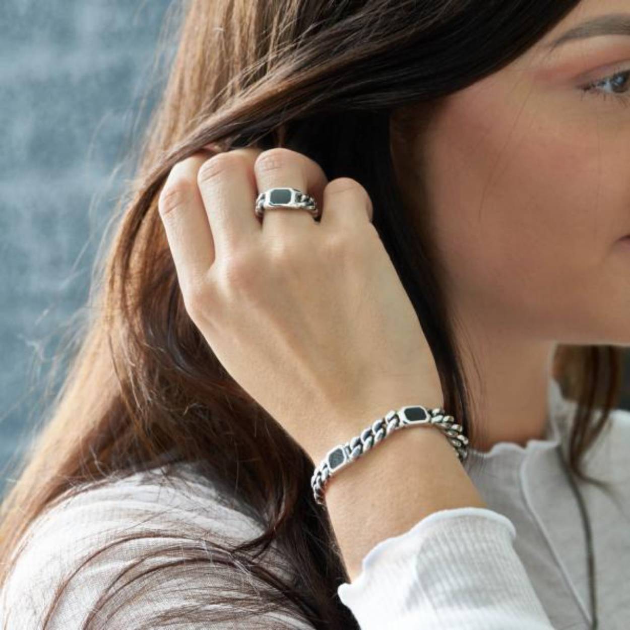 Stoere zilveren schakel armband met zwart resin. De verwerking van de zwart resin / giethars maakt deze handgemaakte zilveren schakel armband opvallend en uniek. De 925 sterling zilveren armband sluit middels een karabijn sluiting. De zilveren armband is onderdeel van een tijdloze stoere doch elegante set. Combineer deze stijlvolle en stoere armband met de nieuwste soepele 691 ring ingelegd met zwart resin, draag daarbij de bijpassende zilveren 686 ketting met het 692 hangertje.