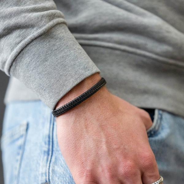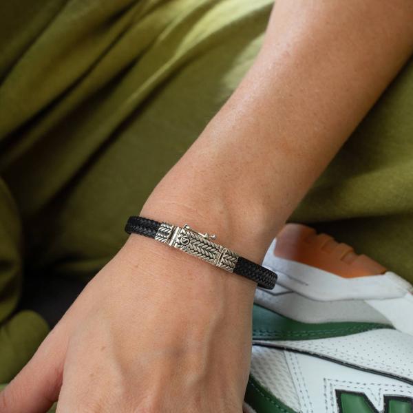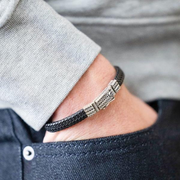 De gevlochten zwart leren band creëert, net als zijn zilveren tegenhanger, een krachtig en tijdloos patroon dat over de lengte van het sieraad loopt. Dit maakt de armband niet alleen duurzaam, maar ook een echte eyecatcher die bij elke outfit past.