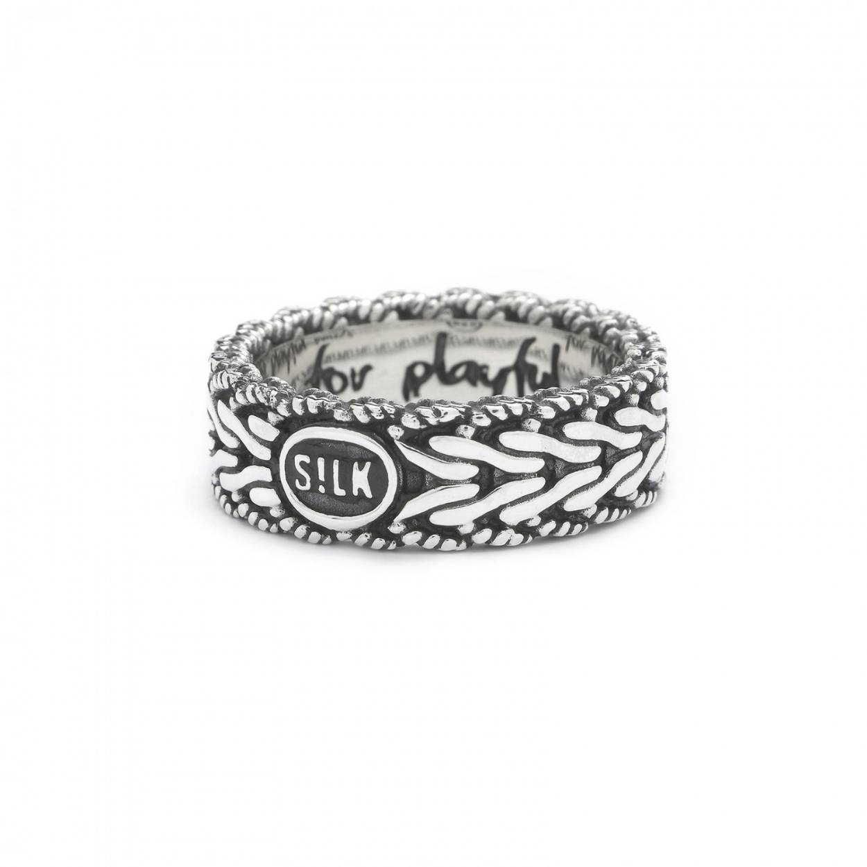 Deze gevlochten zilveren ring heeft een platte gedecoreerde vissegraat structuur. De draad aan de buitenzijde van deze ring heeft een fijn decoratief detail in de draad wat hem sierlijk maakt. De ring heeft dezelfde structuur als een van onze Infinite collection armbanden waardoor je deze daarmee goed kan combineren.