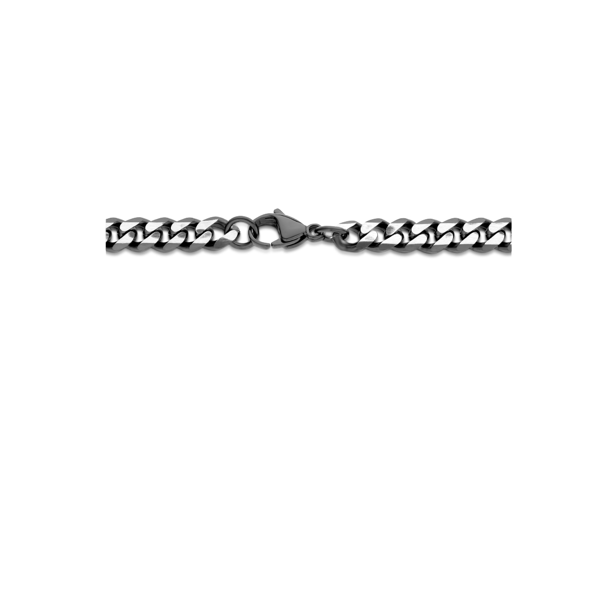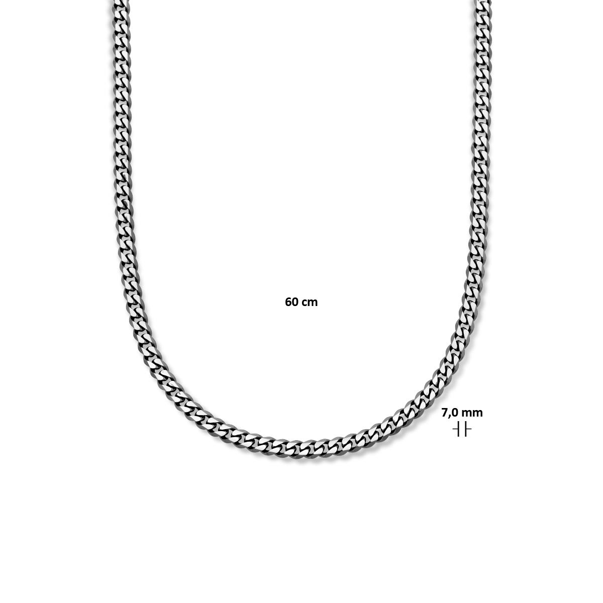 Stalen gourmette lengte artikel met een zwartkleurige ion plating. Het lengte artikel heeft een schakelbreedte van 7mm en een karabijn sluiting.