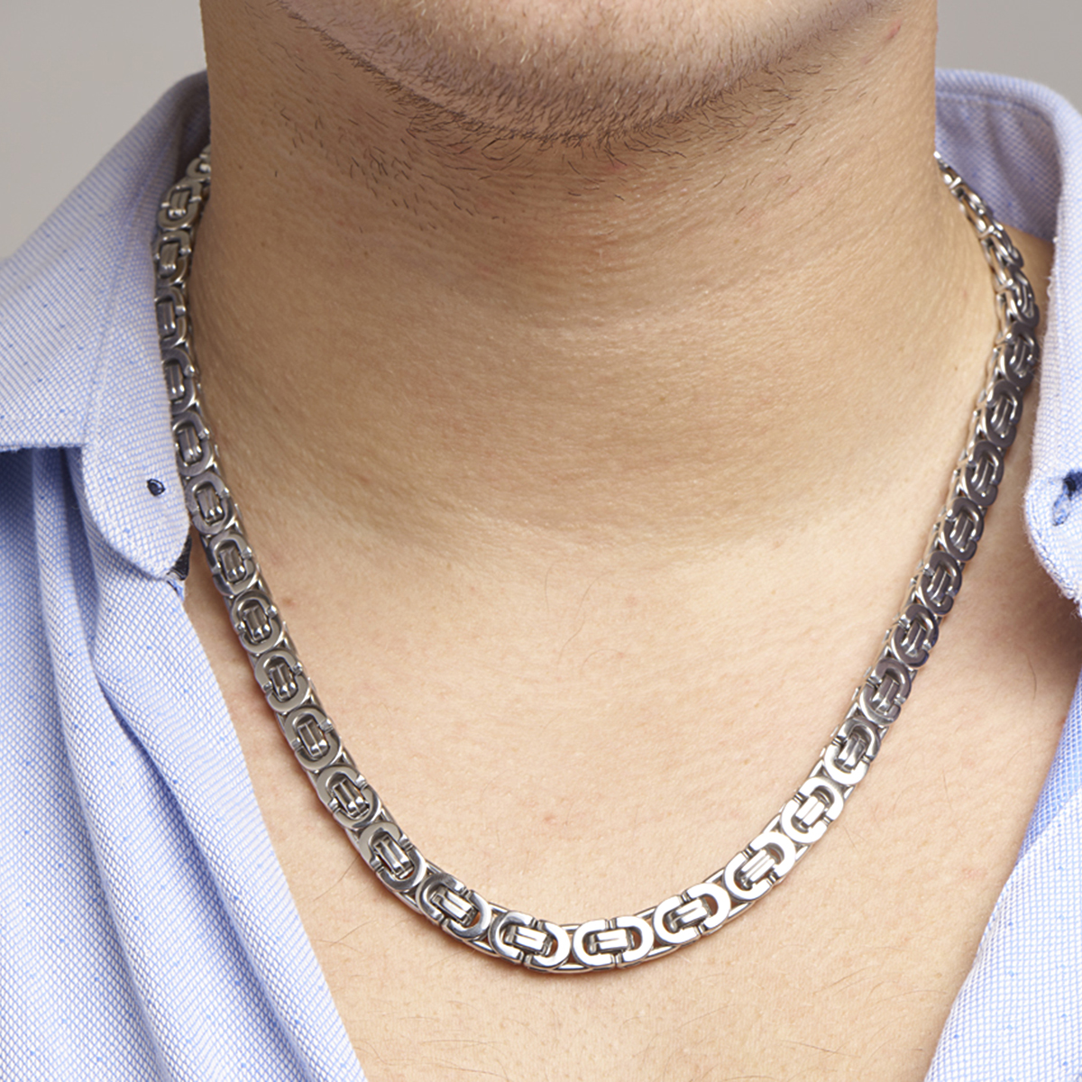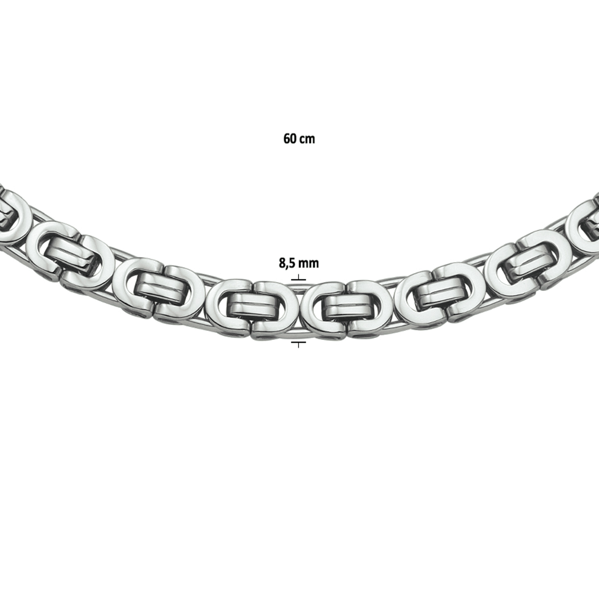 Stalen lengte artikel met een koningsschakel. Het lengte artikel heeft een stevige karabijn sluiting. De schakelbreedte is 8.5mm.