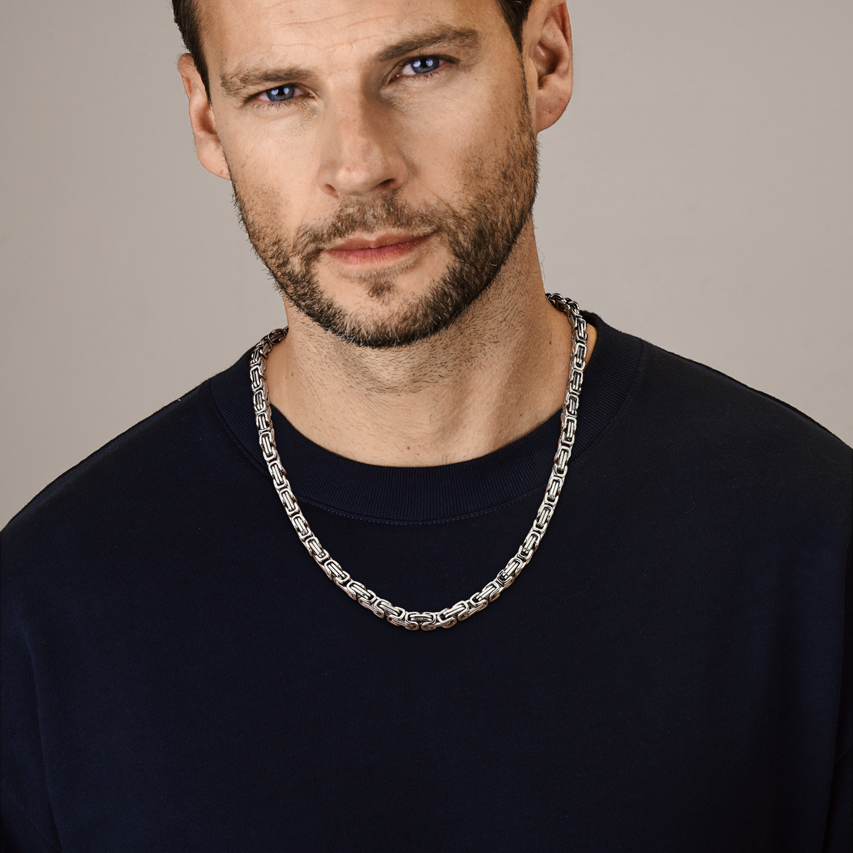 Stalen lengte artikel met een koningsschakel. Het collier heeft een schakelbreedte van 8.5mm en is voorzien van een stevige karabijnsluiting