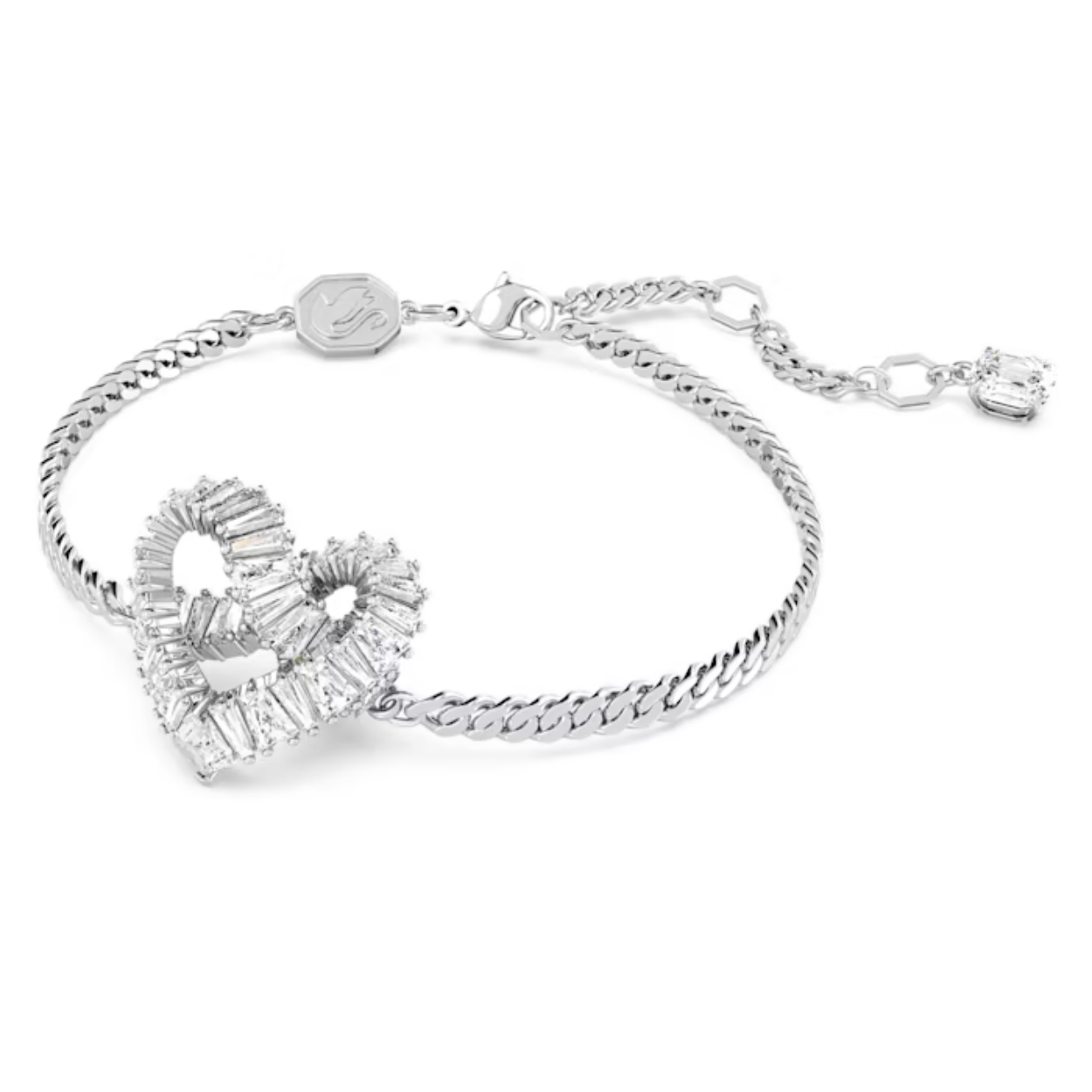 De samengeweven look van deze armband met rhodium toplaag is werkelijk uniek. Om het schitterende effect te creëren, vloeit het ontwerp over in een elegante hartvorm die volledig is voorzien van heldere kristallen met een baguette-slijpvorm.