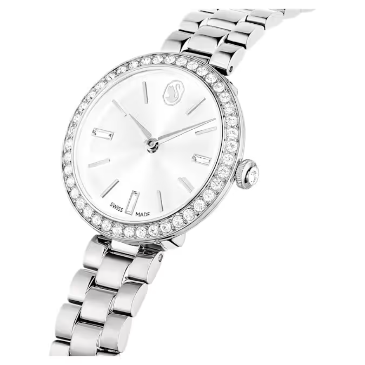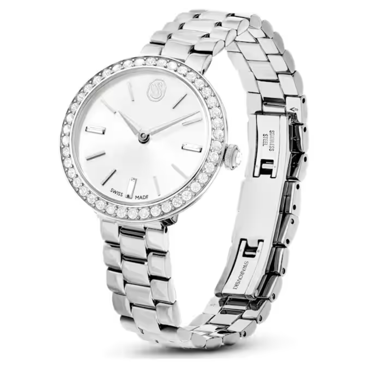 Dit Certa-horloge combineert de stralende glinstering van Swarovski met eigentijds design en is de perfecte combinatie van vakmanschap en functionaliteit. De edelstalen kast van 30 mm is voorzien van een lunette bezet met een glinsterend pavé van 42 kristallen. Op de stralende sunray wijzerplaat met zonnestraalpatroon prijken een elegant zwaanlogo ter hoogte van de 12 en drie uuraanduidingen met kristallen in Baguette-slijpvorm. In de kroon is een kristal gezet en de metalen armband met drie schakels zit comfortabel om de pols. Dit Swiss Made horloge is waterbestendig tot 50 meter en vormt een tijdloze keuze als aanvulling op uw dagelijkse stijl.