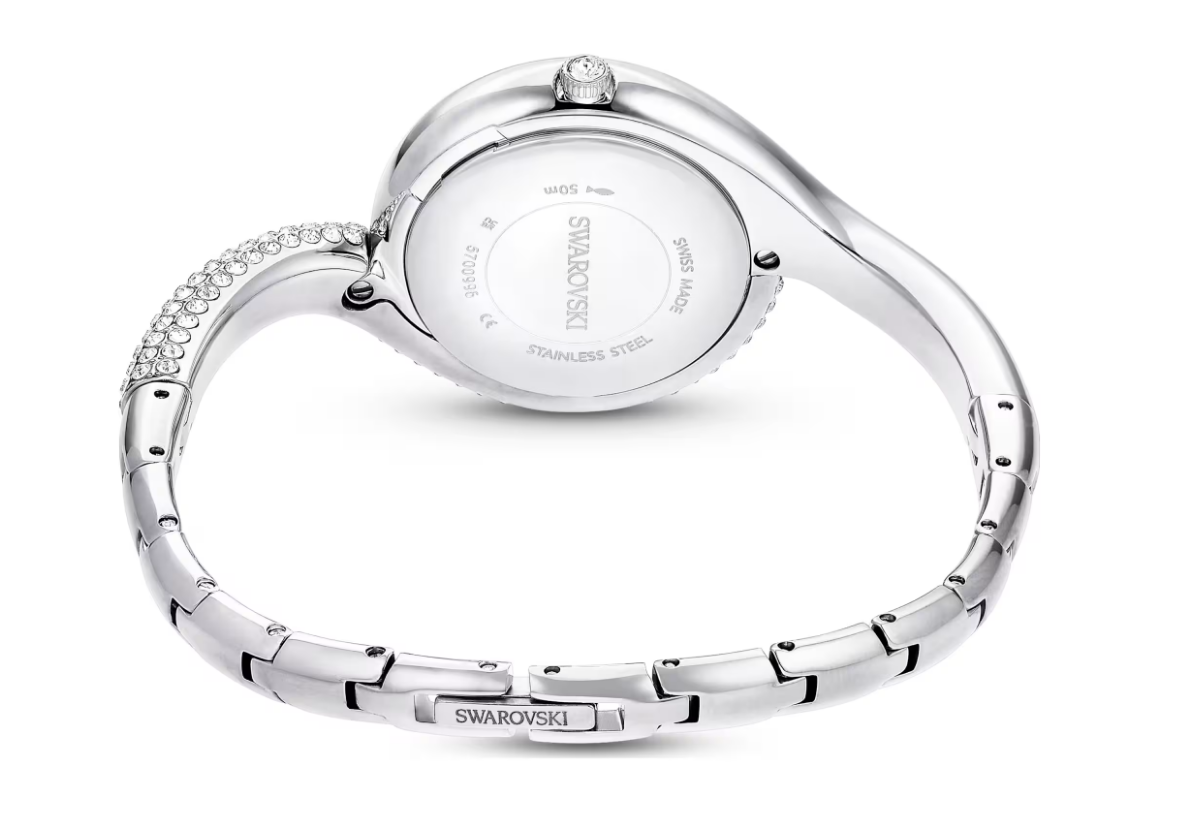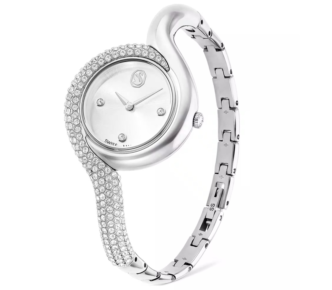 Dit fascinerende Dextera-horloge is geïnspireerd op de klassieke uurwerken uit een vintage tijdperk. Het edelstalen ontwerp van 29 mm is creatief versierd met een pavé van heldere kristallen over de helft van de bezel en de helft van de armband. De minimalistische wijzerplaat heeft een zonnestraleneffect en wordt alleen geaccentueerd door drie kristallen uurmarkeringen en een zwaanlogo op 12 uur. Er zijn in totaal 203 kristallen gebruikt bij de creatie van dit horloge, inclusief het kristal in de kroon. Dit Swiss Made horloge is waterbestendig tot 50 meter en is een pure uiting van de verfijning van Swarovski.