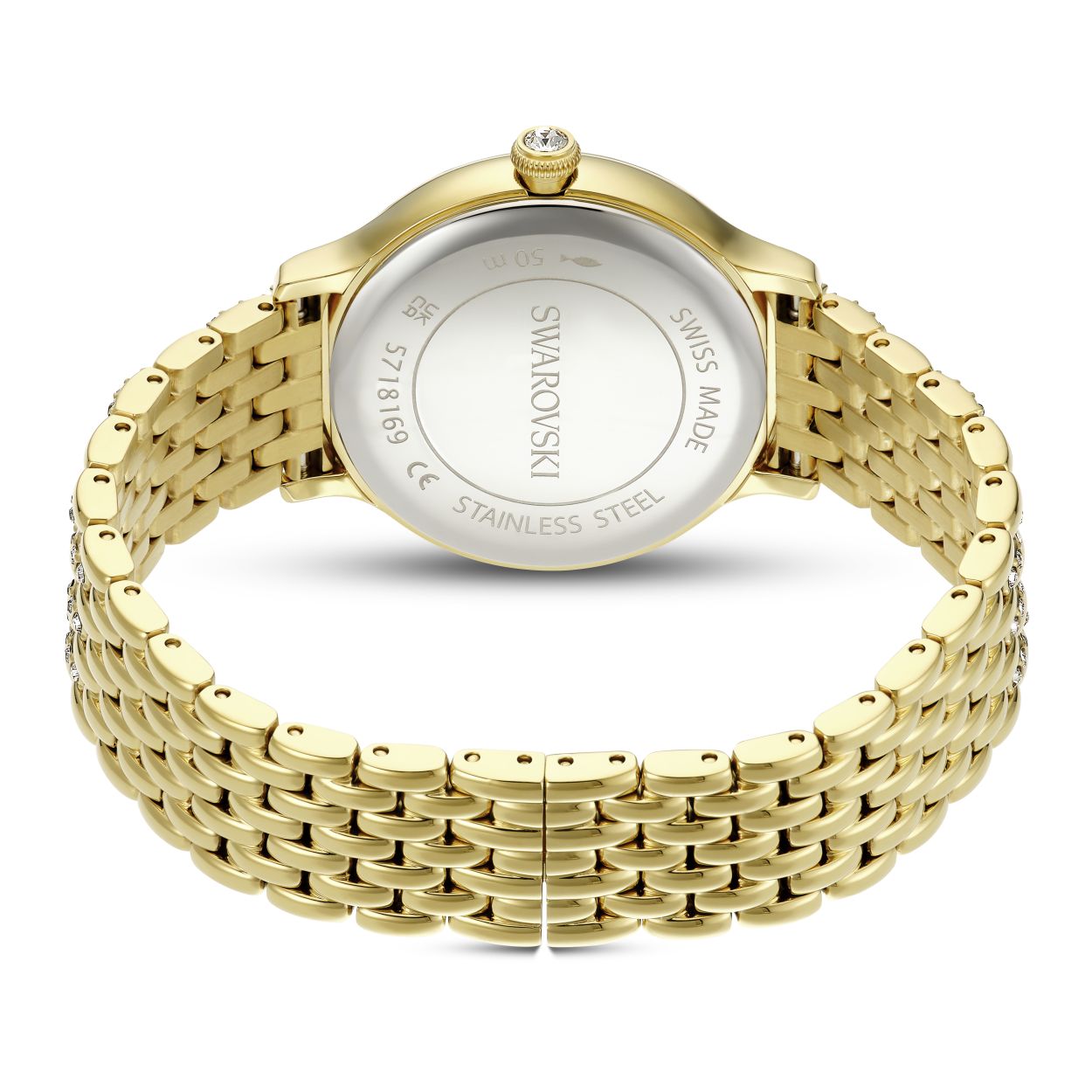 Dit glinsterende Imber-horloge, versierd met 232 individuele kristallen, is Swarovski's mooiste uitdrukking van tijdloze elegantie. Het edelstalen ontwerp van 31 mm heeft een goudkleurige afwerking en is voorzien van een pavé lunette bezet met 52 heldere kristallen. In de kroon is nog een extra kristal geplaatst. Op de wijzerplaat met zonnestralenpatroon zijn 11 kristallen in kleine en grote maten gebruikt om de uren aan te geven, samen met een zwaanlogo op 12 uur. Om de pols is het meest opvallende kenmerk van het horloge de verstelbare armband met zeven schakels, die prachtig bezet is met 168 kristallen in Round-slijpvorm. Dit Swiss Made horloge is waterbestendig tot 50 meter en past naadloos bij de selectie Imber-sieraden van Swarovski.