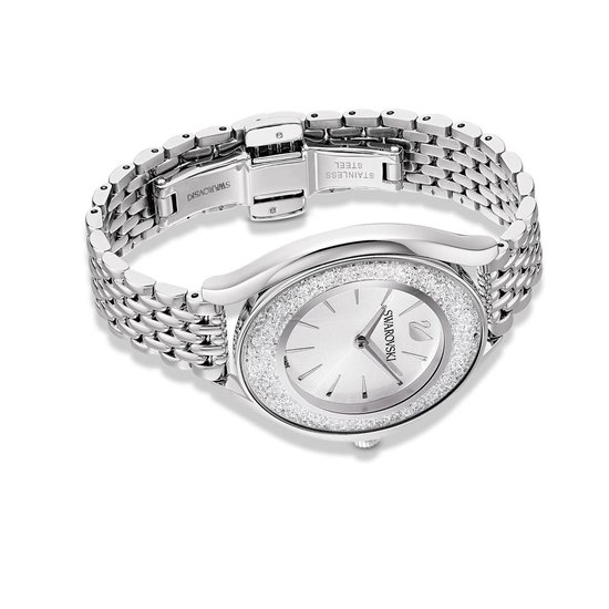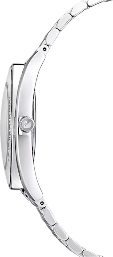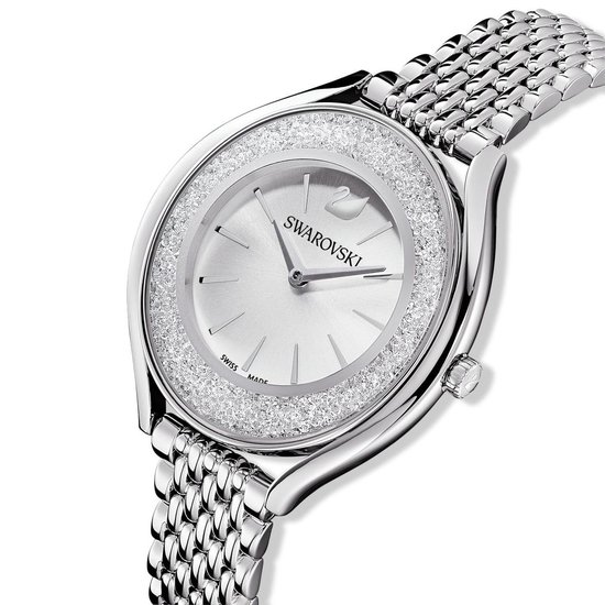 Zeer elegant: dit Swarovski-horloge uit onze Crystalline Aura-collectie combineert op kundige wijze vorm en functie. Meer dan 1300 kristallen in de roestvrijstalen kast zorgen voor een schitterend sprankelend effect. Een roestvrij stalen armband en een witte zilverkleurige wijzerplaat met de Swarovski-zwaan op 12 uur maken het geraffineerde ontwerp compleet. Dit Zwitserse horloge is waterbestendig tot 50 meter.