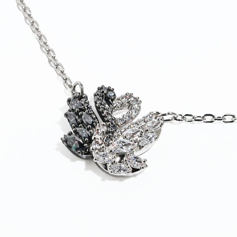 Celebrating Swarovski’s eternal emblem of love and beauty, this swan pendant will infuse any outfit with elegance. Suspended from a delicate chain, the central motif showcases two intertwined swans, in rhodium and ruthenium plating, with an all-over decoration of black and white Swarovski Zirconia in round and marquise cuts. A beautiful example of Swarovski savoir-faire that will remain forever timeless.