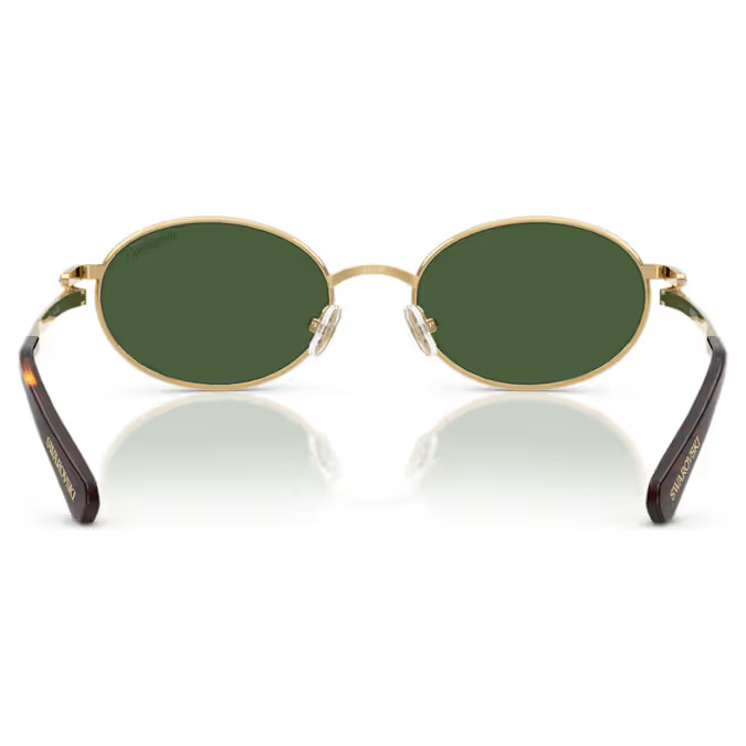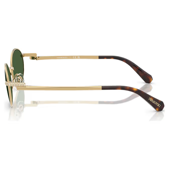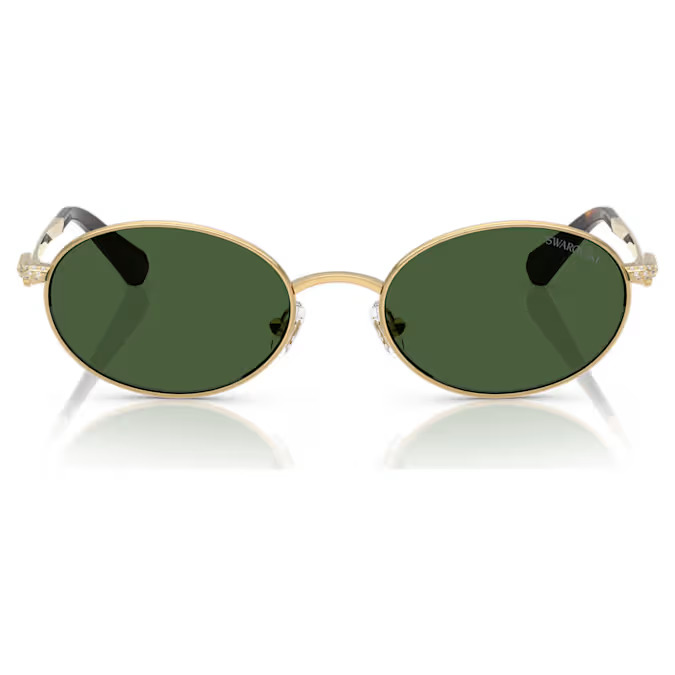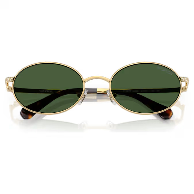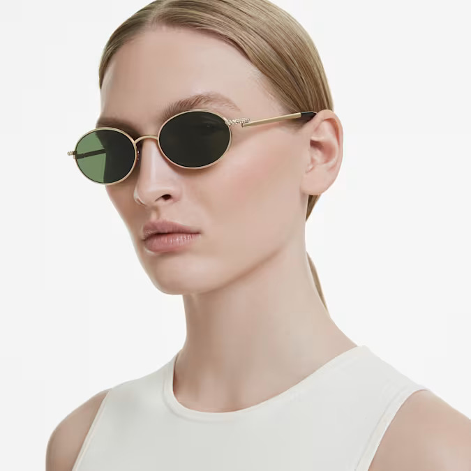 Deze zonnebril met ovale glazen legt de focus op klassieke elegantie. Het slanke ontwerp is geïnspireerd op de ringen uit de Dextera-sieradenfamilie en is voorzien van een goudkleurig montuur, donkergroene glazen en een uniek scharnier dat is verfraaid met een verfijnde pavé. Het is een slank silhouet en een stralend voorbeeld van Swarovski’s savoir-faire dat elke look een vleugje pure elegantie geeft.