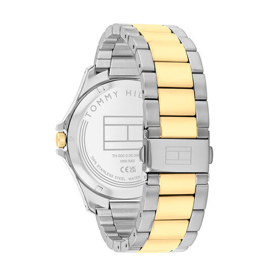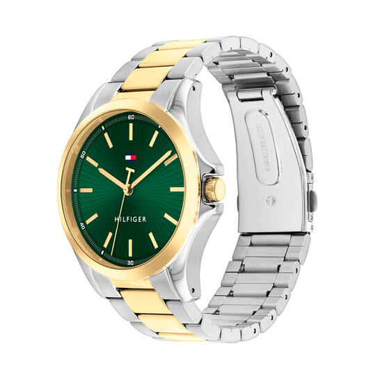 Dit Tommy Hilfiger horloge, uit de Bruce collectie, heeft een bicolor stalen band en kast. De wijzerplaat is groen met goudkleurige indexen en wijzers