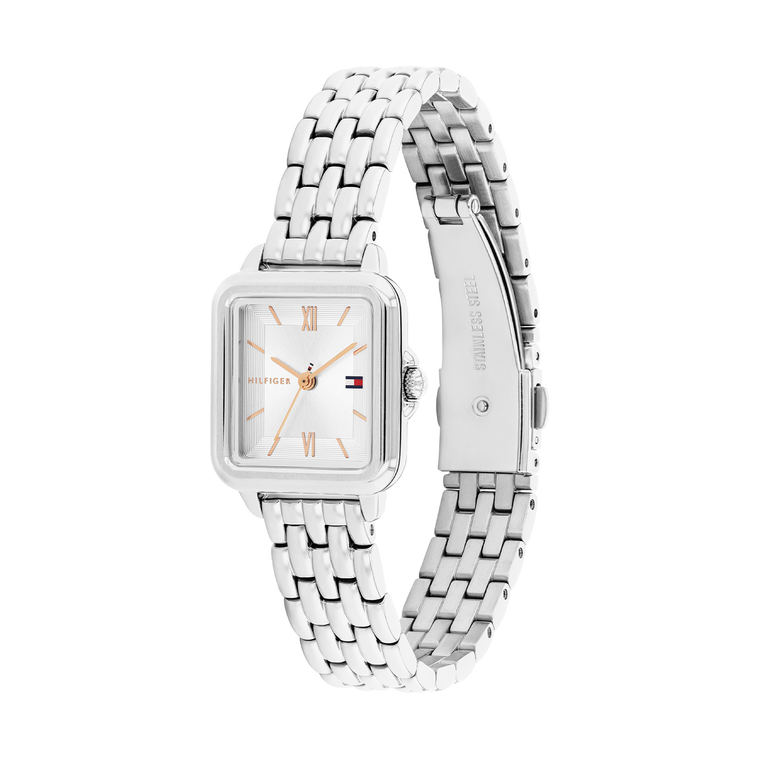Dit specifieke horloge van Tommy Hilfiger uit de Mia serie met artikelnr: TH1782830 is een chique casual dameshorloge die niet in je collectie mag ontbreken. Het stalen dameshorloge heeft een rechte kast met een zilverwitte bewerkte sunray wijzerplaat met fijne wijzers en het Tommy logo. De Romeinse 12 en 6 vallen extra op naast de fijne uurstreepjes. Aan de kast zit een stalen schakelband met een vouwsluiting. Het horloge heeft een mineraalglas, een afmeting van 24x22,5mm en is 3ATM.