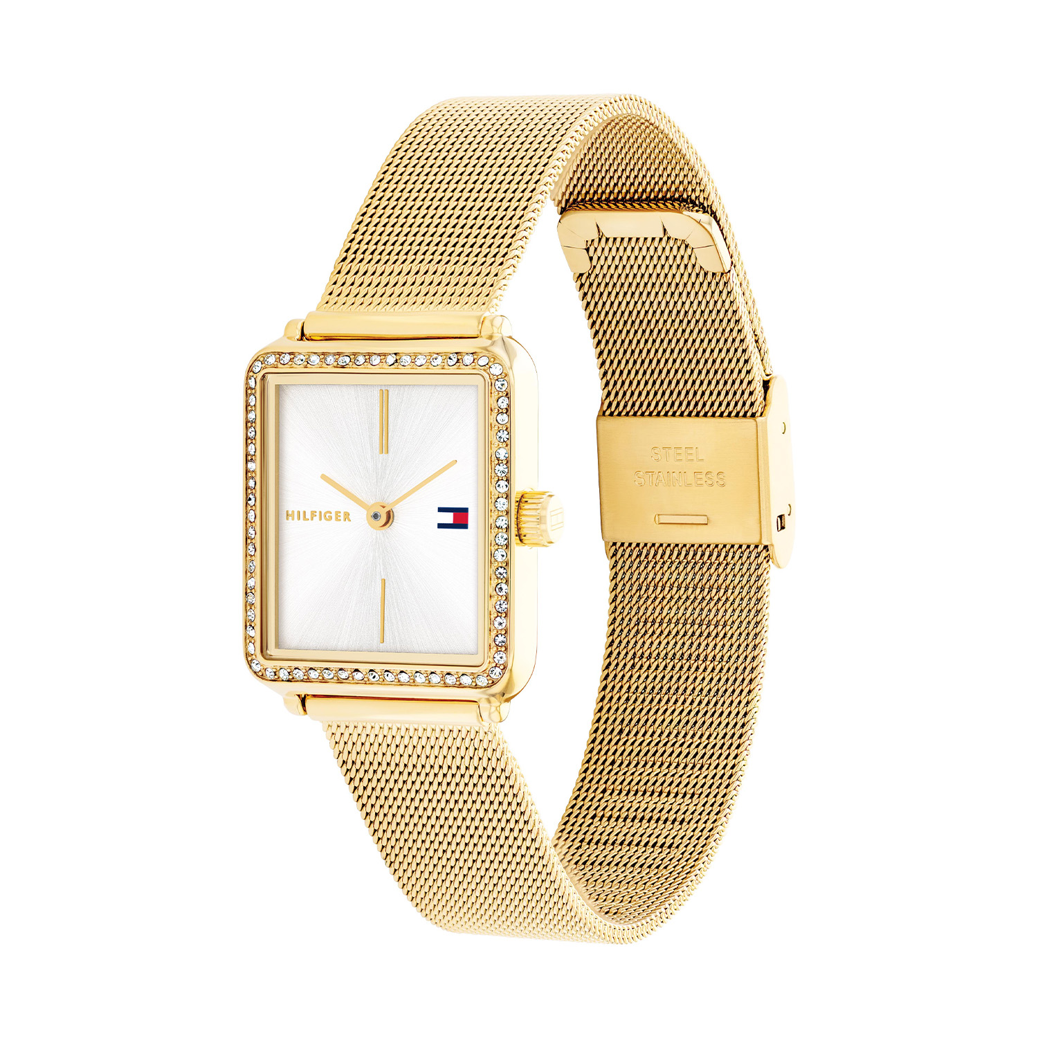 Dit specifieke horloge van Tommy Hilfiger uit de Tea Tank serie met artikelnr: TH1782829 is een chic dameshorloge die niet in je collectie mag ontbreken. Het stalen dameshorloge heeft een rechthoekige goudkleurige kast met een bezel volgezet met kristallen, een zilverwitte sunray wijzerplaat met fijne wijzers en het Tommy logo. Aan de kast zit een goudkleurige milanese band met een druksluiting. Het horloge heeft een mineraalglas, een afmeting van 21x24mm en is 3ATM.
