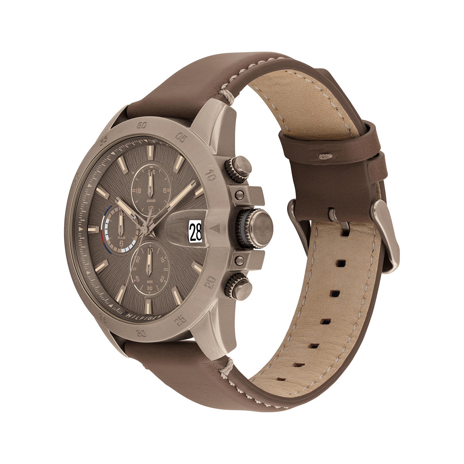 Dit specifieke horloge van Tommy Hilfiger uit de Jameson serie met artikelnr: TH1792196 is een net herenhorloge die niet in je collectie mag ontbreken. Het herenhorloge heeft een ronde stalen khaki kleurige kast met een khaki kleurige bedrukte bezel en een khaki kleurige bewerkte wijzerplaat met een datum met extra bol venster en lumibrite inleg op de wijzers en op de uurstrepen. In de subeyes zit de minuut,- uurs,- en 24-uursaanduiding. Aan de kast zit een khaki kleurige lerenband met een gespsluiting. Het horloge heeft een mineraalglas, een afmeting van 43mm en is 5ATM.