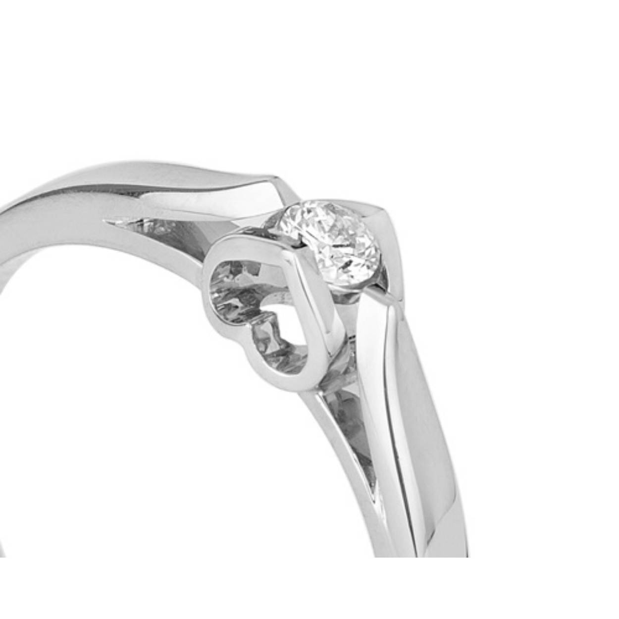 14k witgouden solitair ring met diamant, briljant geslepen. De ring heeft twee witgouden harten in de zetting verwerkt. De briljant is 0.05caraat en heeft WE/SI kwaliteit
