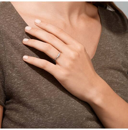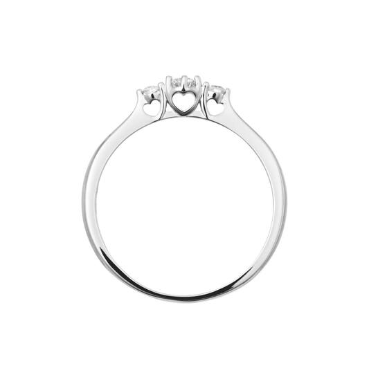 14k witgouden ring met drie briljant geslepen diamanten, met een totale gewicht van 0.145crt. Onder de middensteen is de zetting bewerkt tot een hart.