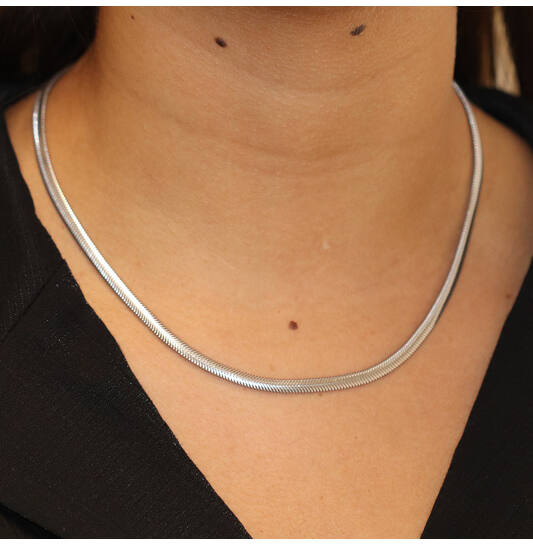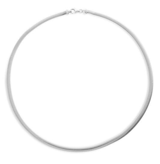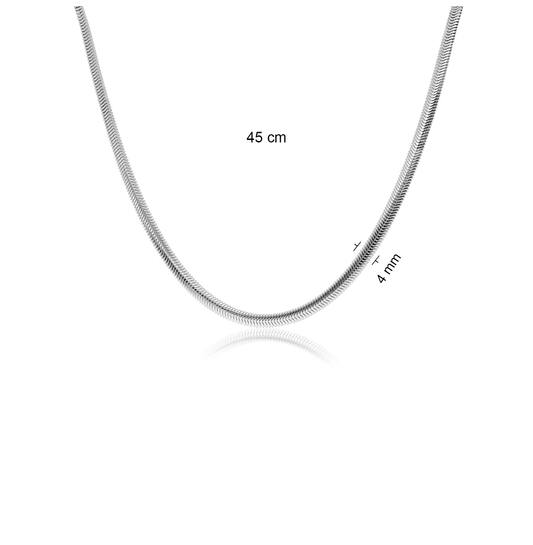Gerhodineerd Sterling Zilveren collier met een vlakke iets gebolde slangen schakel. Bijzonder soepel en elegant.