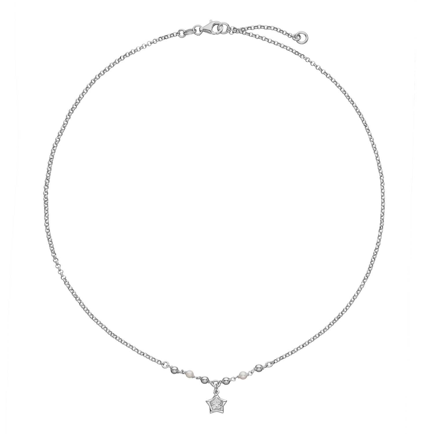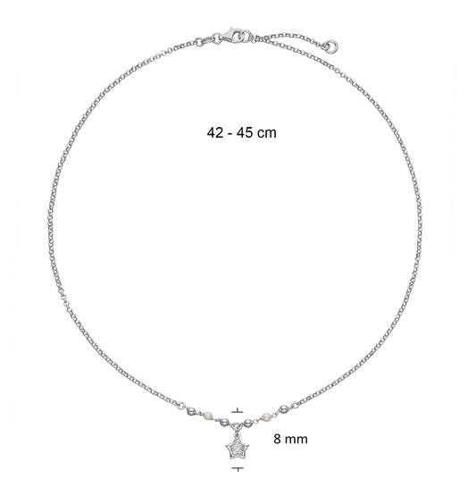 Zilveren collier met een hanger in vorm van een ster, deze is bezet met zirkonia's. Naast de hanger is het collier versierd met twee immitatie parels en vier bolletjes. Het collier is op twee lengtes te dragen, in 42cm en 45cm