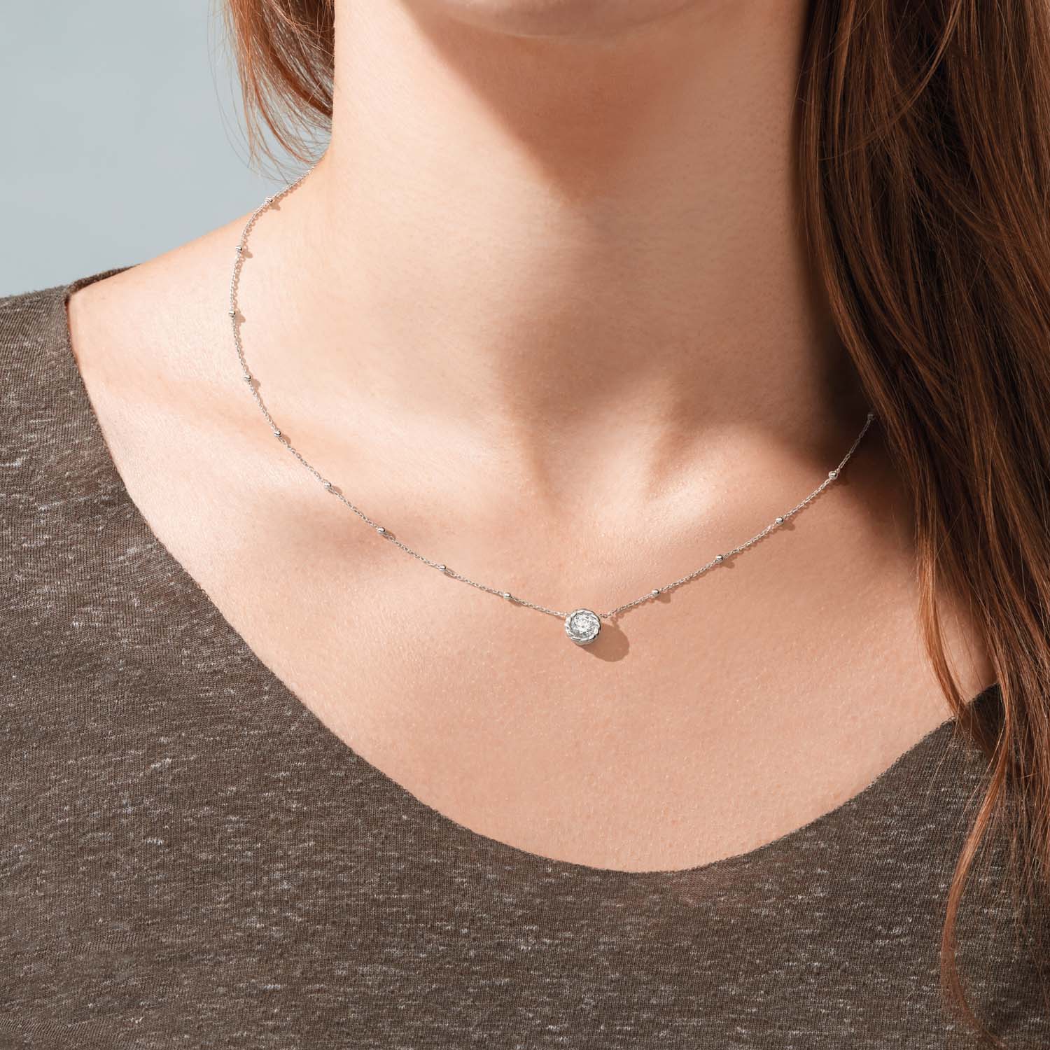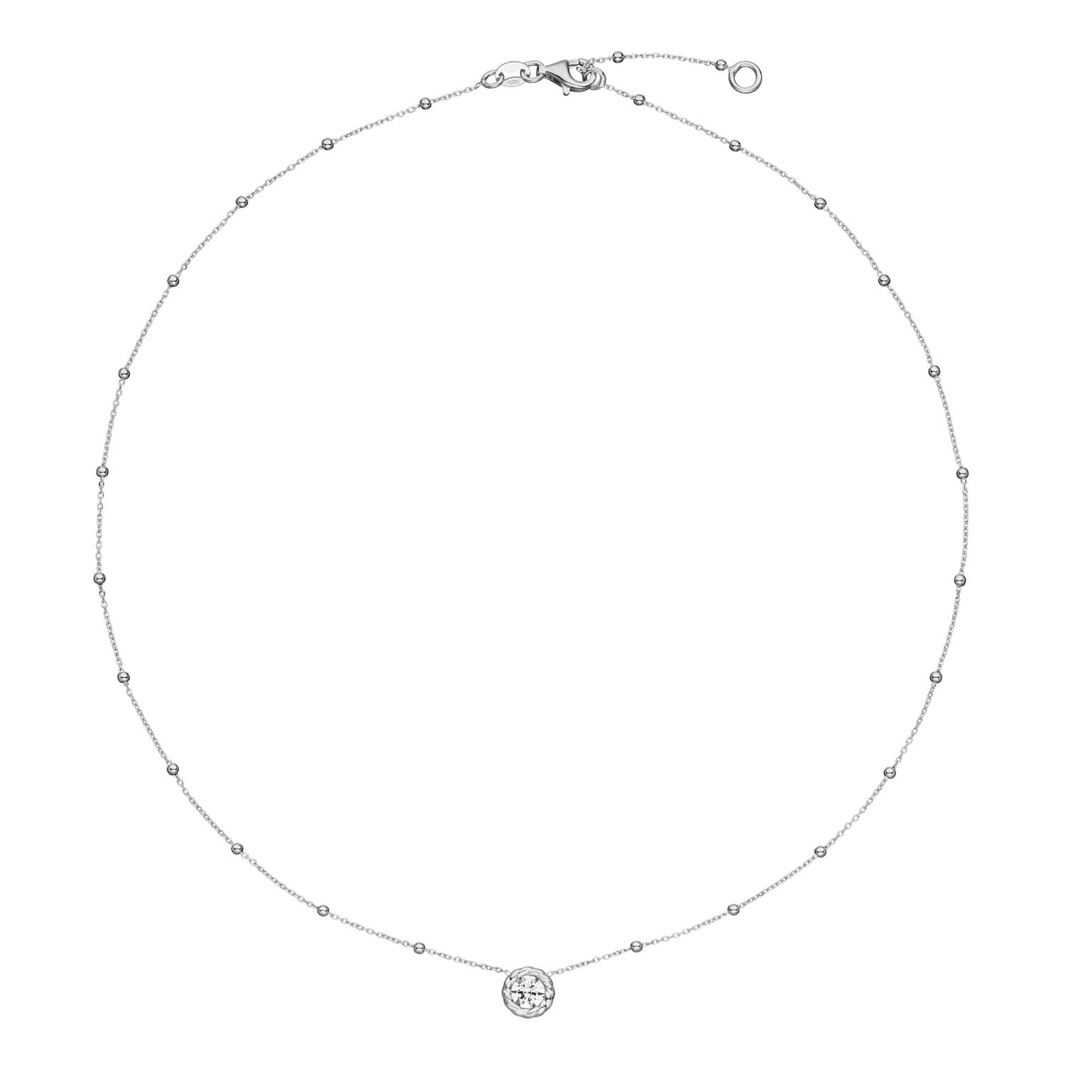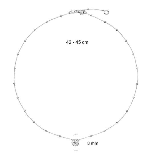 Zilveren collier met een zirkonia hanger, gezet in een ronde zetkast. Het collier is op twee lengtes te dragen, in 42cm en 45cm.