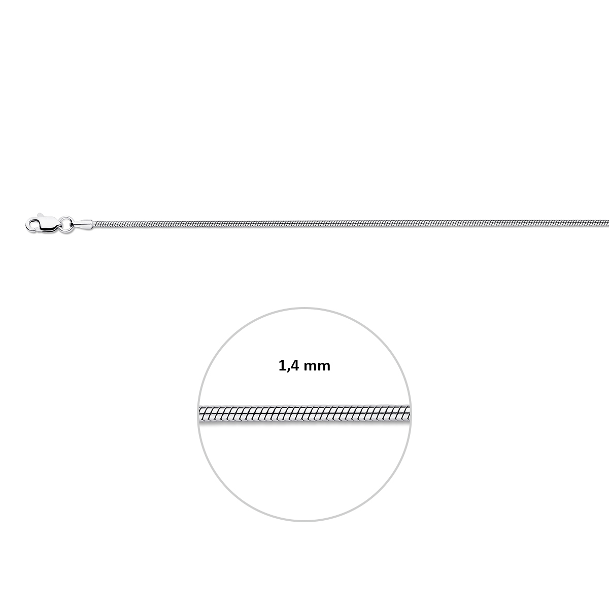 Gerhodineerd zilveren slang collier met een draaglengte van 41cm en een extensie van 4cm. Uitgevoerd met een karabijn sluiting. De schakelbreedte is 1.4mm.