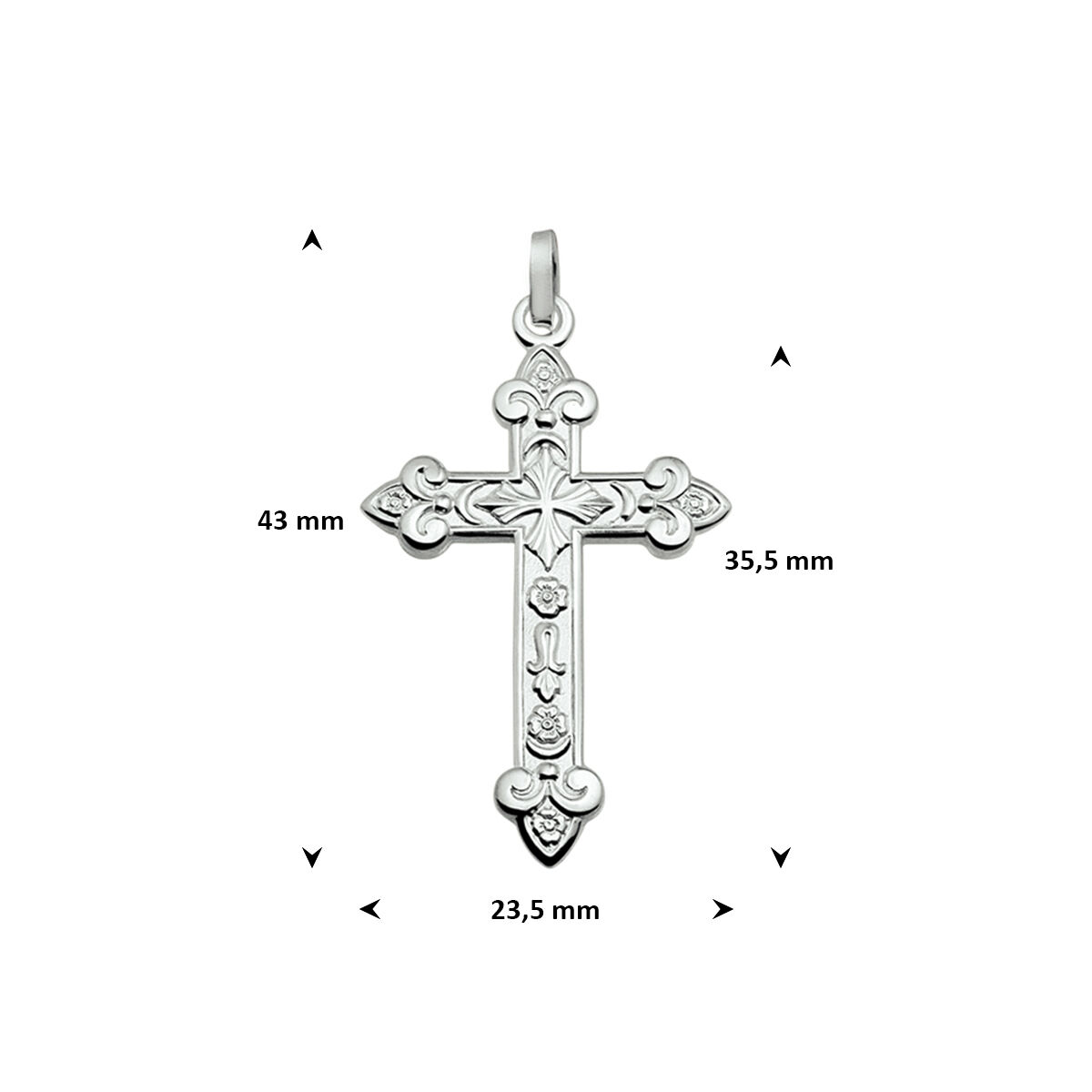 Zilveren kruis uitgevoerd met poli/mat afwerking en stevig oog. De hanger heeft een totale lengte van 4.3cm en het kruis zelf heeft een afmeting van 35.5x23.5mm.