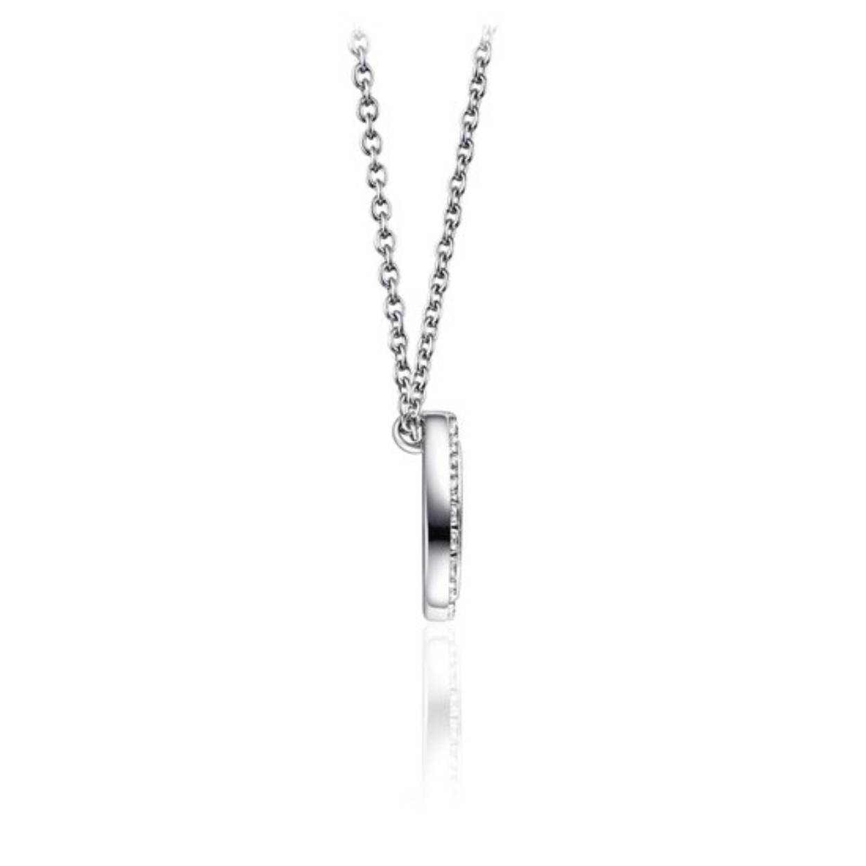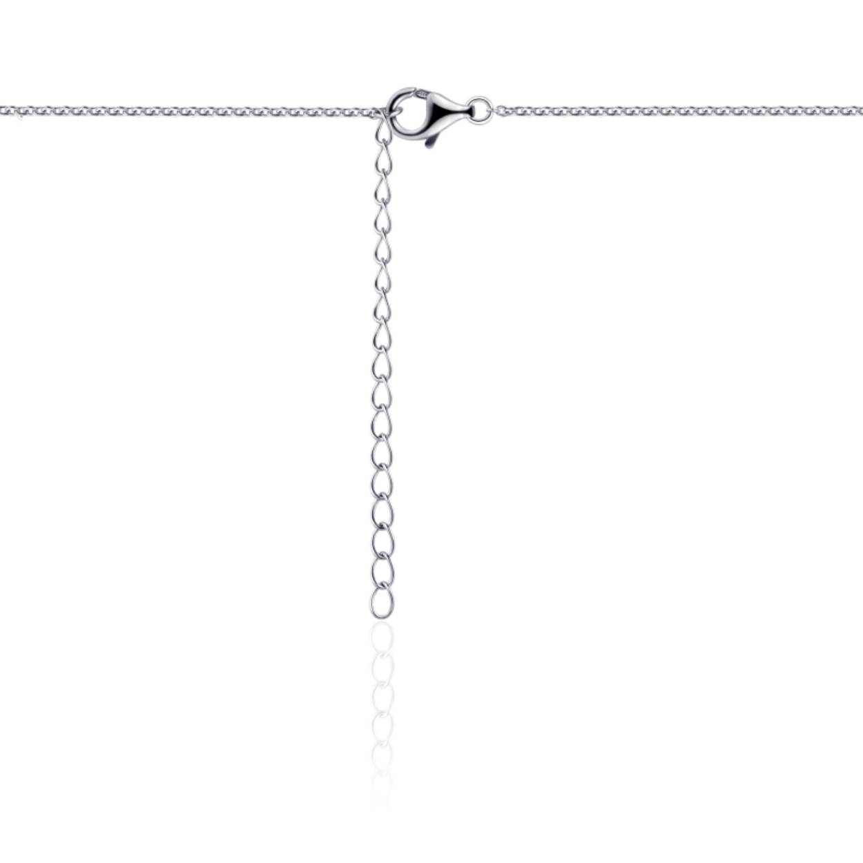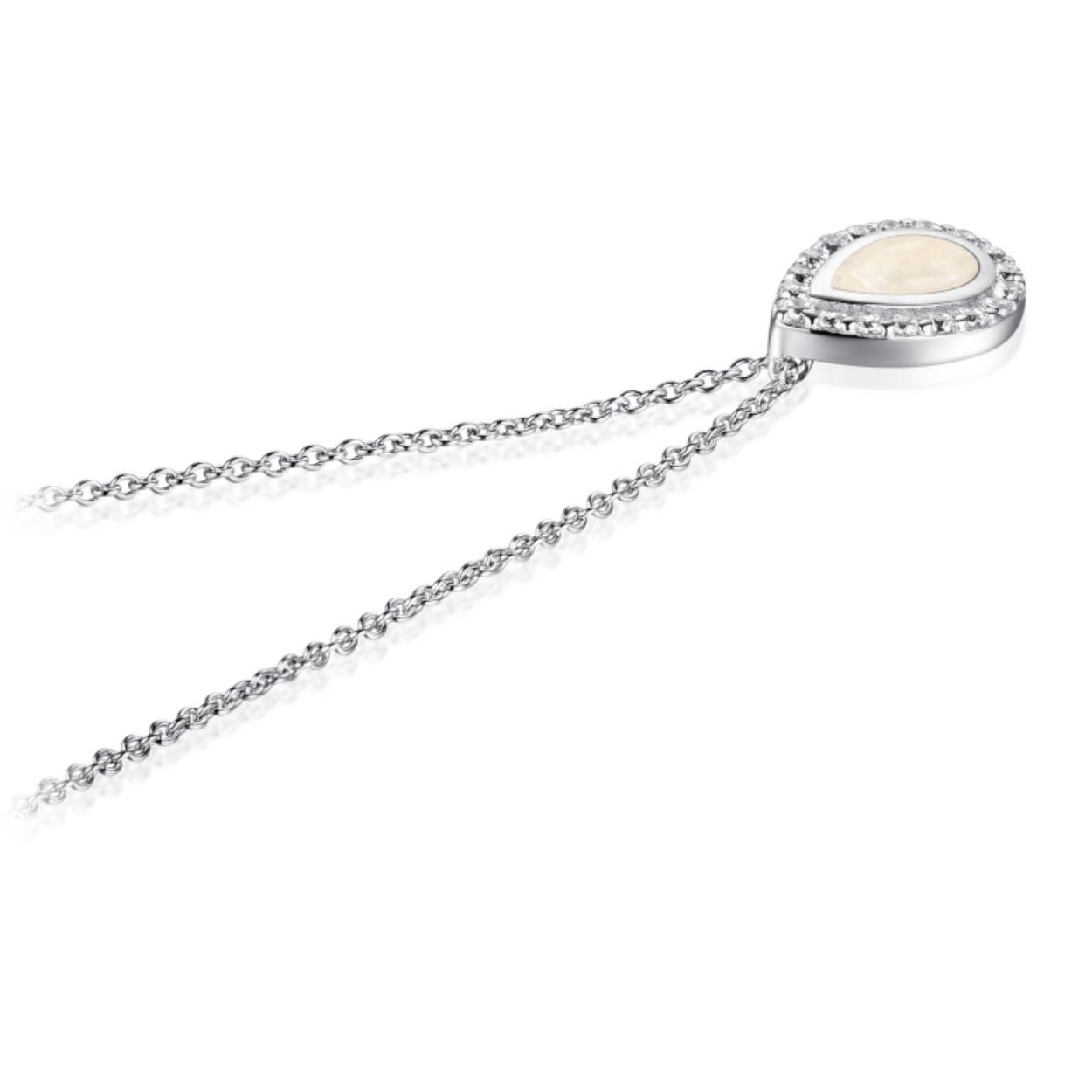 Zilver gerhodineerde hanger in vorm van een druppel. De hanger is ingelegd met parelmoer rondom zijn zirkonia's gezet. Het collier is 42cm met een extensie van 5cm.