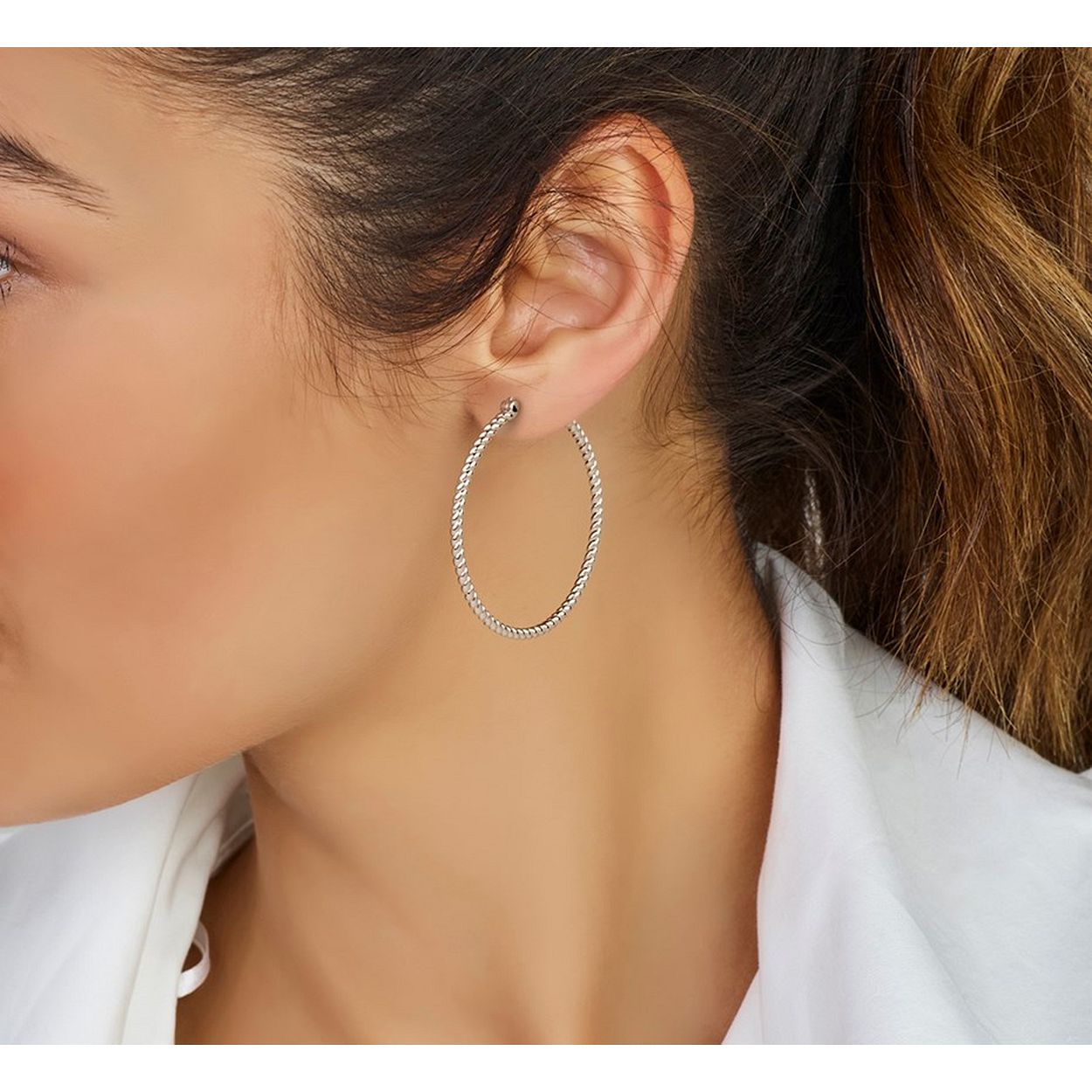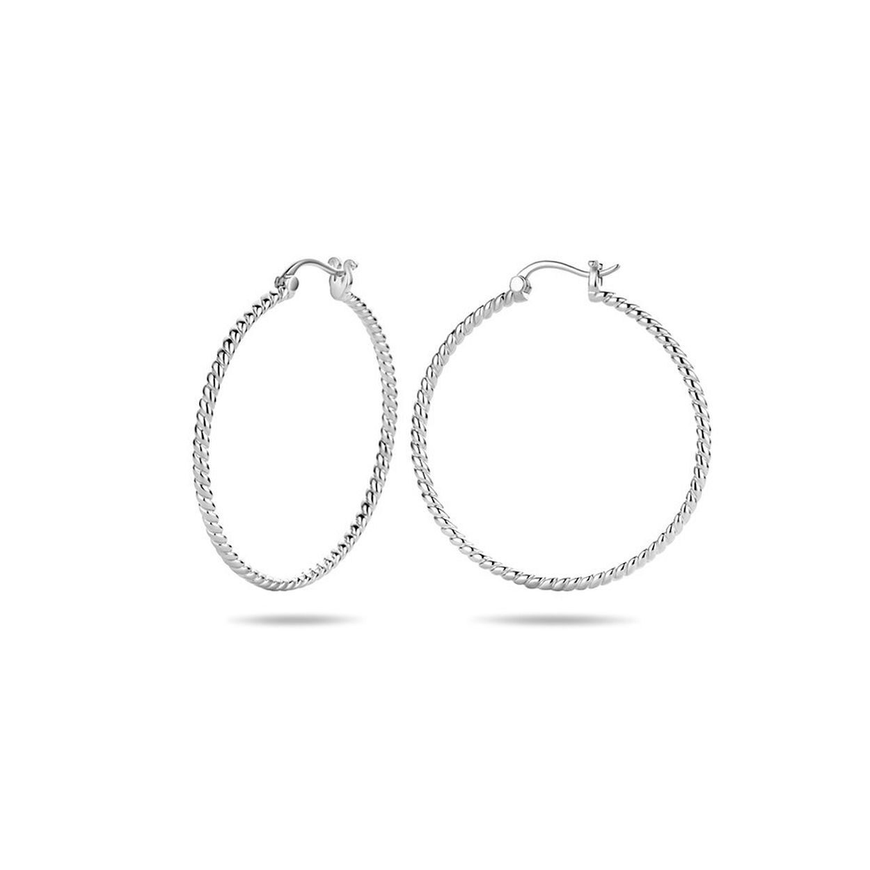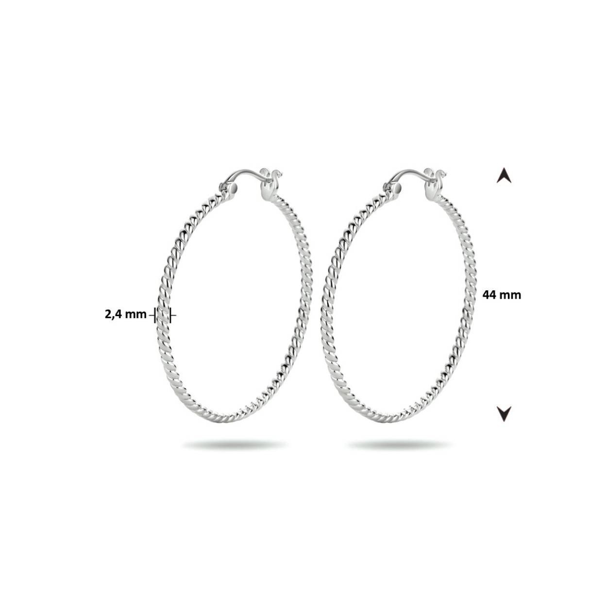 Gerhodineerd zilveren oorringen met een gedraaide afwerking en hefboomsluiting. De oorringen hebben een diameter van 44mm en een dikte van 2.4mm.