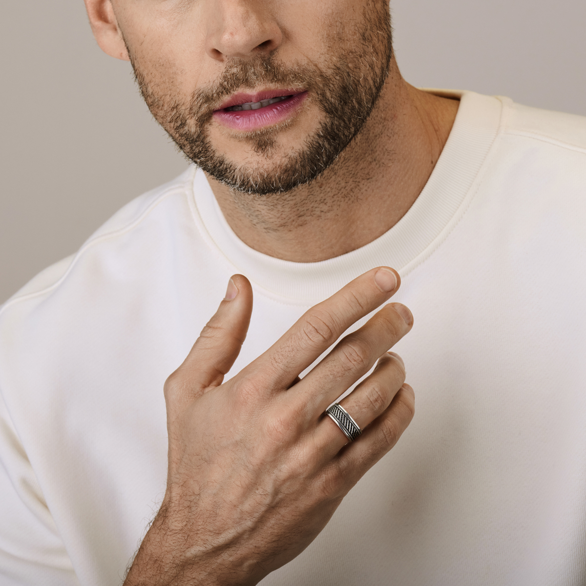 Geoxideerd 925 zilveren ring met een bewerking.  De ring heeft een breedte van 10mm.