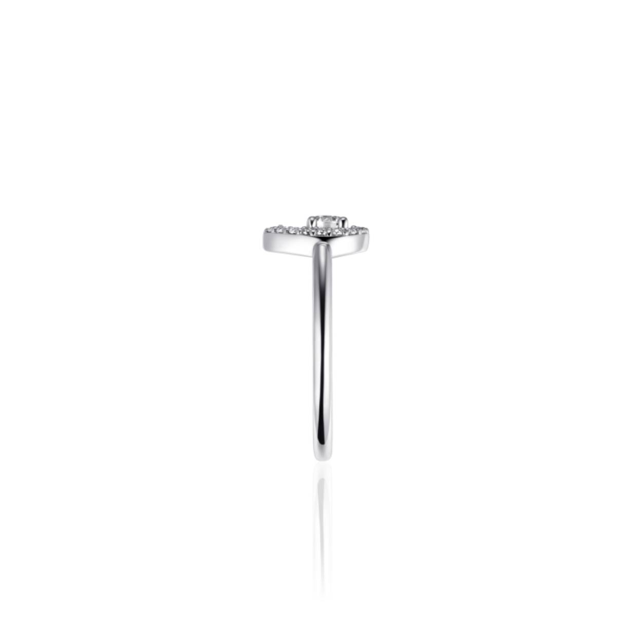 Zilver gerhodineerde ring met zirkonia's, gezet in een druppelvorm.