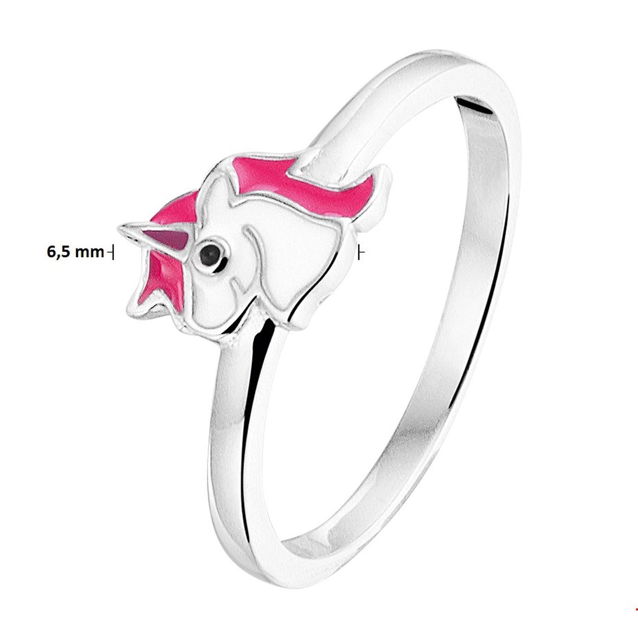 Zilveren ring unicorn met gekleurd roze en wit emaille.