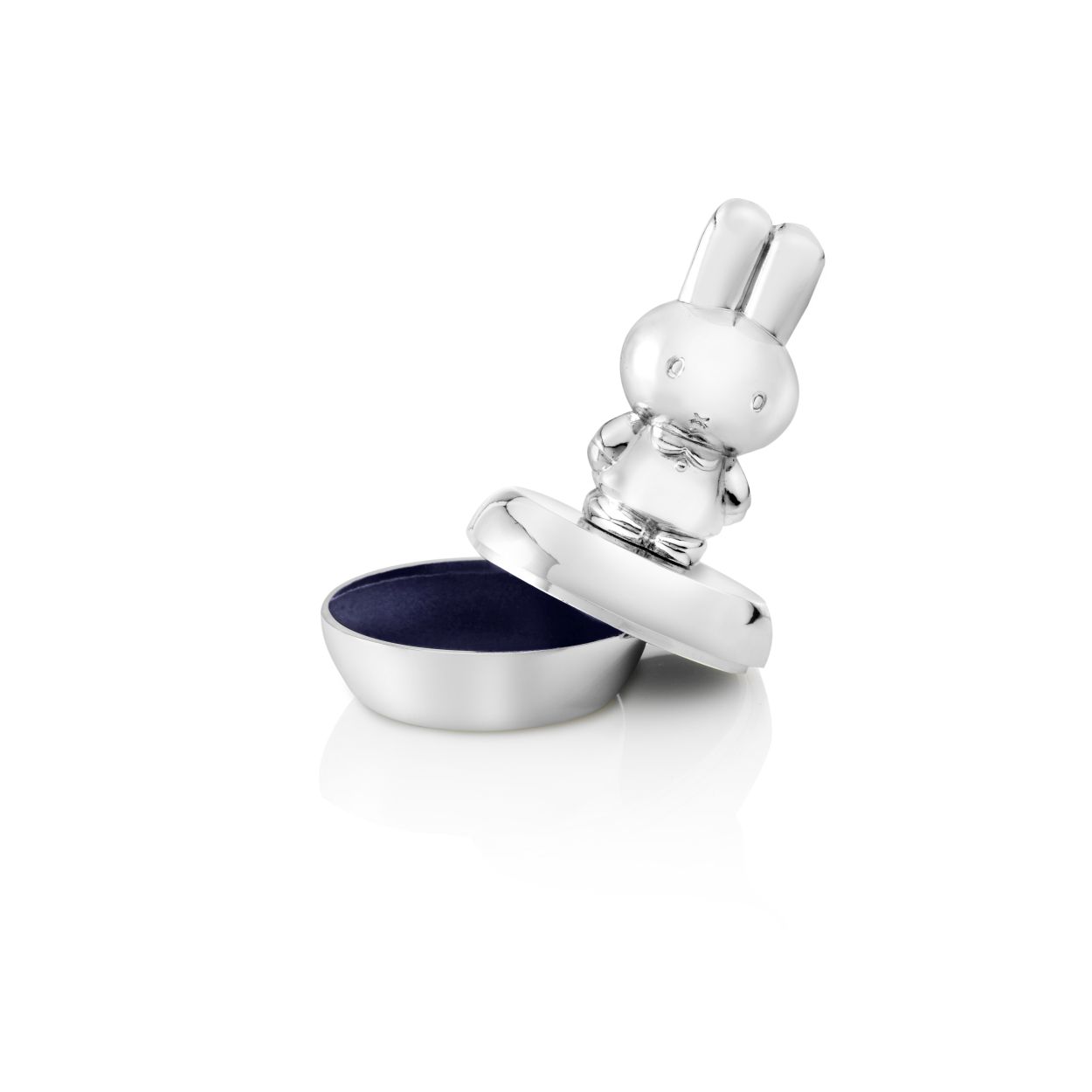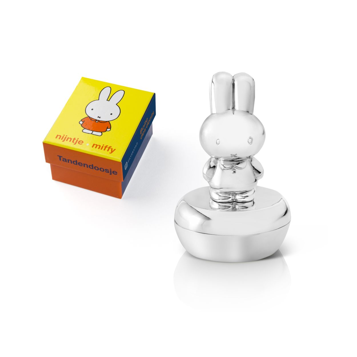 Tanden- of haarlokdoosje met het beroemde konijn Nijntje op de deksel. De binnenzijde is bekleed met blauw velours. Dit doosje kan gegraveerd worden, wat het een persoonlijk geschenk maakt en is in zilver kleur. Poetsen is overbodig.