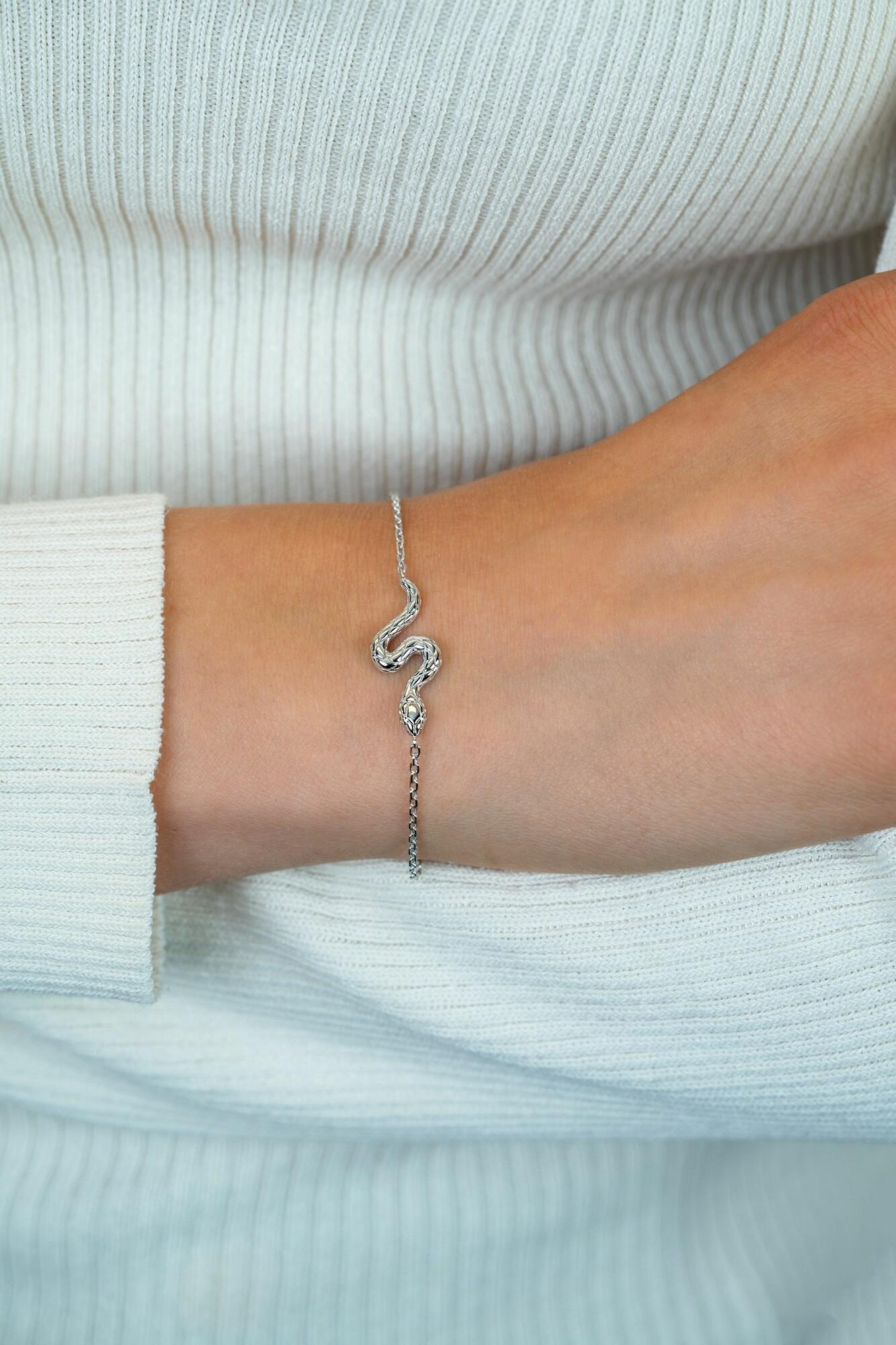 ZINZI zilveren armband met een elegante slang, met witte zirkonia's als ogen. Voorzien van een verlengkettinkje voor optimaal comfort. De armband is vervaardigd van eerste gehalte zilver (925) en voorzien van een extra rodiumlaag voor een langdurige glans.