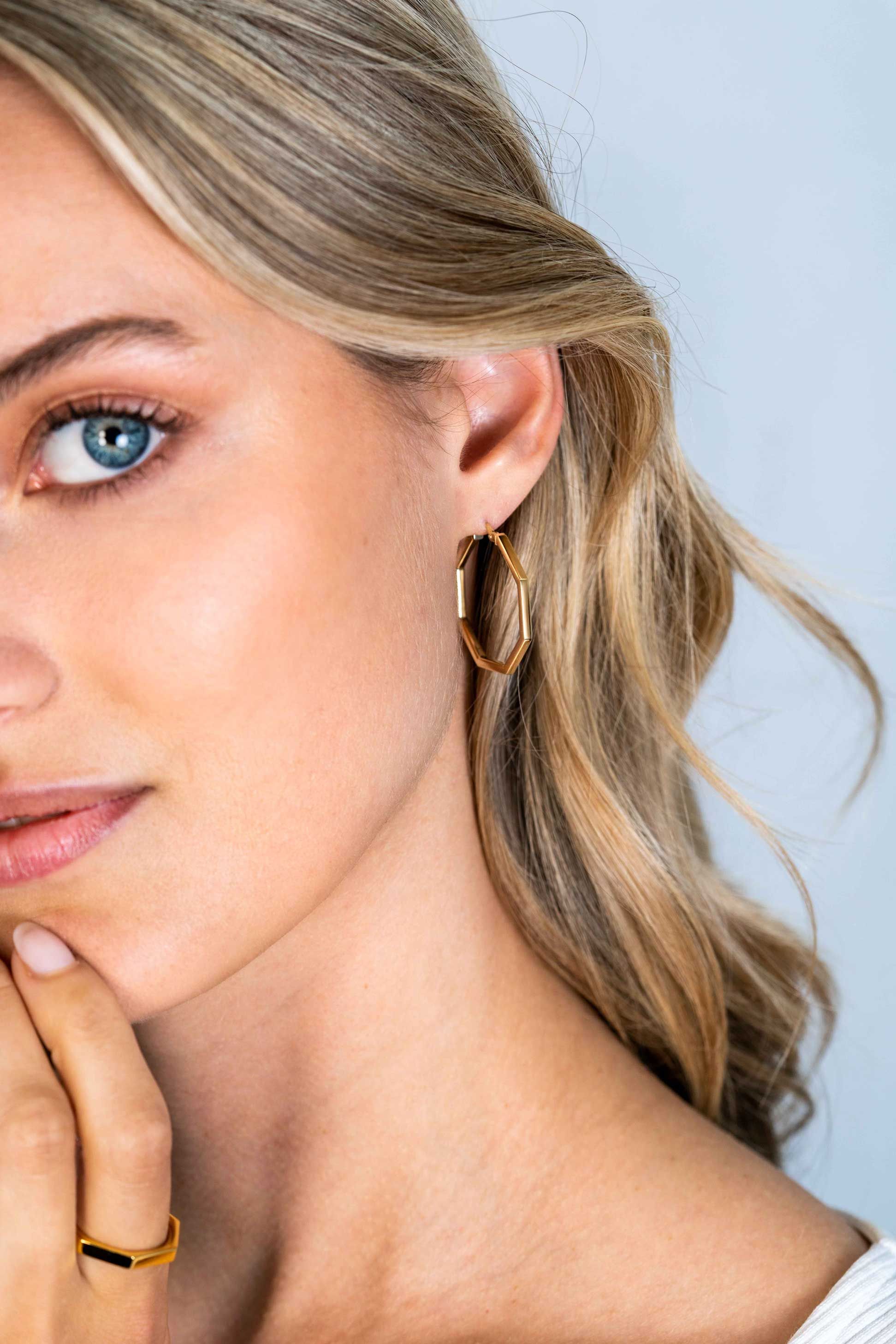 ZINZI gold plated zilveren oorringen in trendy zeshoek vorm. Grootte 27mm met 2mm gladde vierkante buis. Met gemakkelijke hefboom-sluiting. Vervaardigd van eerste gehalte zilver (925) en voorzien van een extra 14K geel vergulding.