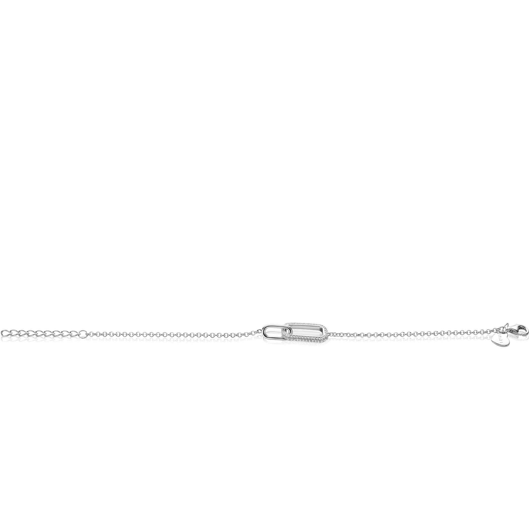 ZINZI zilveren armband waarbij in het midden twee open schakels mooi met elkaar verbonden zijn: een rechthoekige schakel bezet met witte zirconia's en een kleinere gladde ovale schakel. De lengte is te variëren tussen 16,5 en 19,5cm. Met herkenbaar Zinzi hartje bij de sluiting. Vervaardigd van eerste gehalte zilver (925) en met extra rodiumlaag voor een langdurige glans.